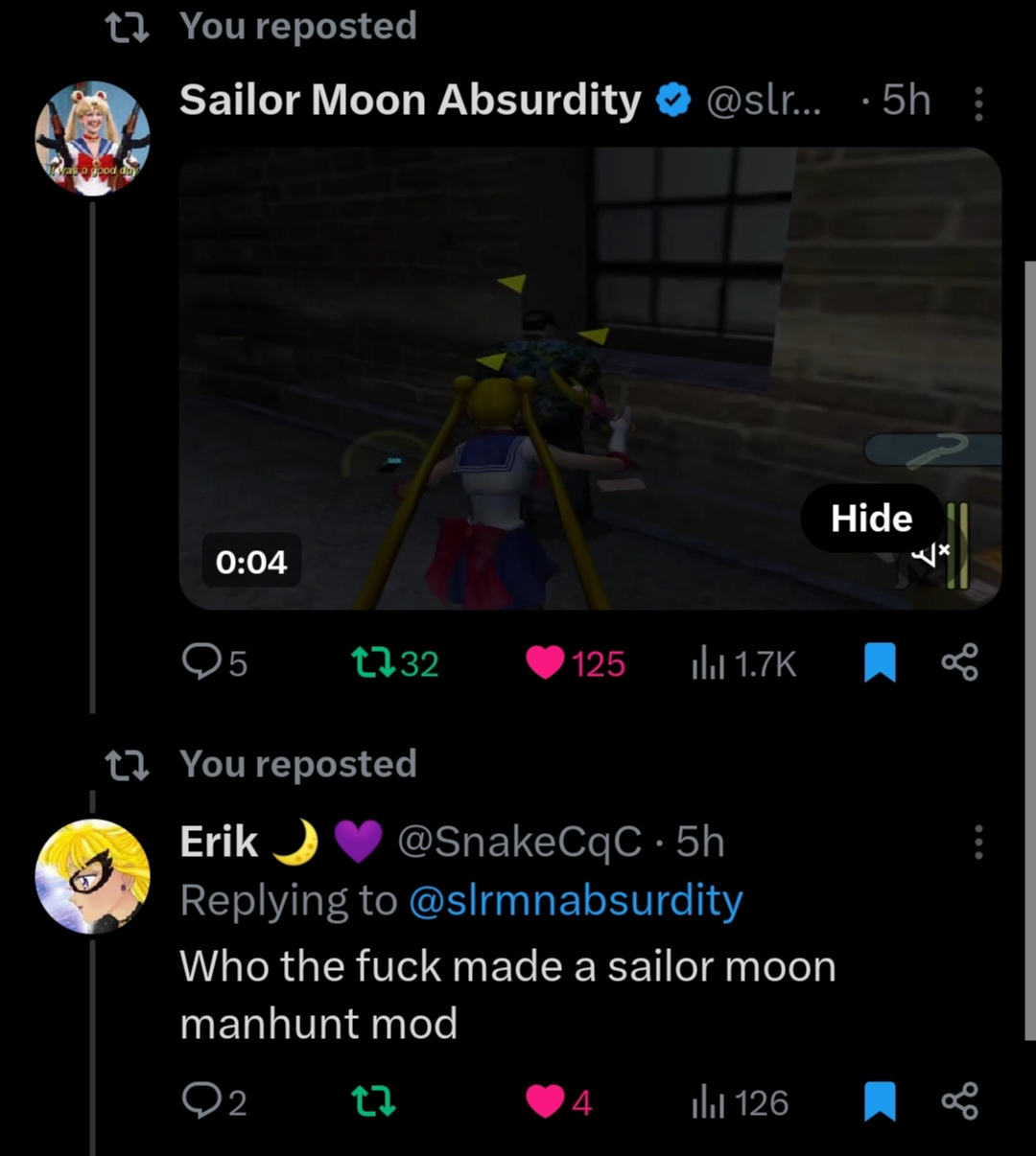 >>283318603>>283318816Because I like sailor moon and gore :DI got the idea when I was working on a previous mod about naked women skins and i said hmmm what if i add teeanege girls with shrot skirts to all this madness?