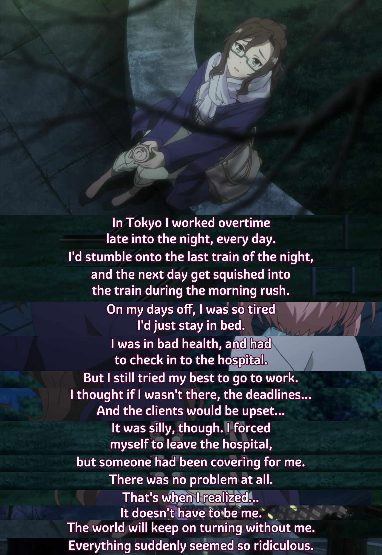 >>283245362>speedrunning through tragic backstories until we've reached the episode number where it's time for the finale to be very cohesiveNTA but I think that format works quite well for a 12 episode show. Maebashi Witches did this well too, and I found it worked because there was a big emotional payoff behind it. It worked especially well because the cast was developed enough to make that payoff feel earned. The ideal format for me would be something more dynamic and flexible, like what you see in MyGO, Odd Taxi, or Tari Tari. But that kind of storytelling usually comes at the cost of only focusing on two or three characters instead of expanding on everyone.