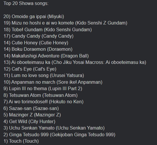 >>283252374It was Showa only. Lum no Love Song rated 5th or so I think.
