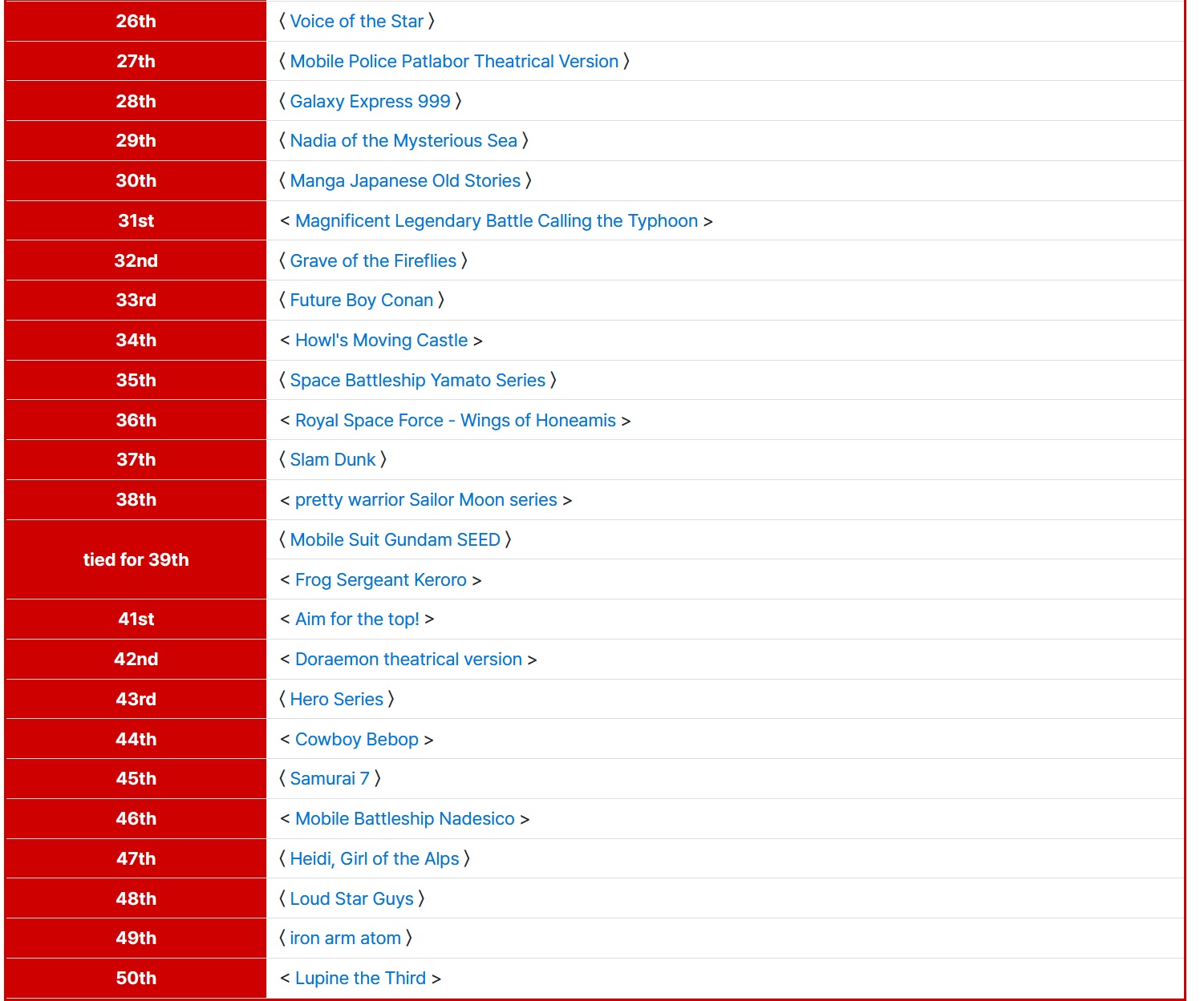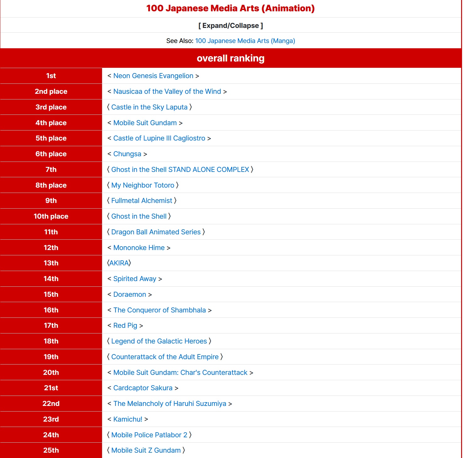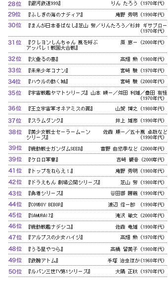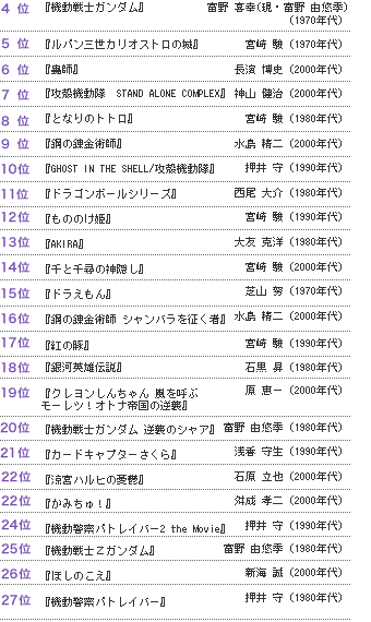 >>283279999Actual top 25 (No particular order)1. Evangelion2. Nausicaa3. Pokemon4. Gundam5. Lupin III6. Astro Boy7. Mazinger Z8. Hokuto no Ken9. Perfect Blue10. Ghost in the Shell11. Dragon Ball12. Ashita no Joe 13. Akira14. Spirited Away15. Doraemon16. Battleship Yamato17. Sailor Moon18. FLCL19. Slam Dunk20. Madoka Magica21. Cardcaptor Sakura22. Haruhi Suzumiya23. Princess Knight24. Love Live25. SAO