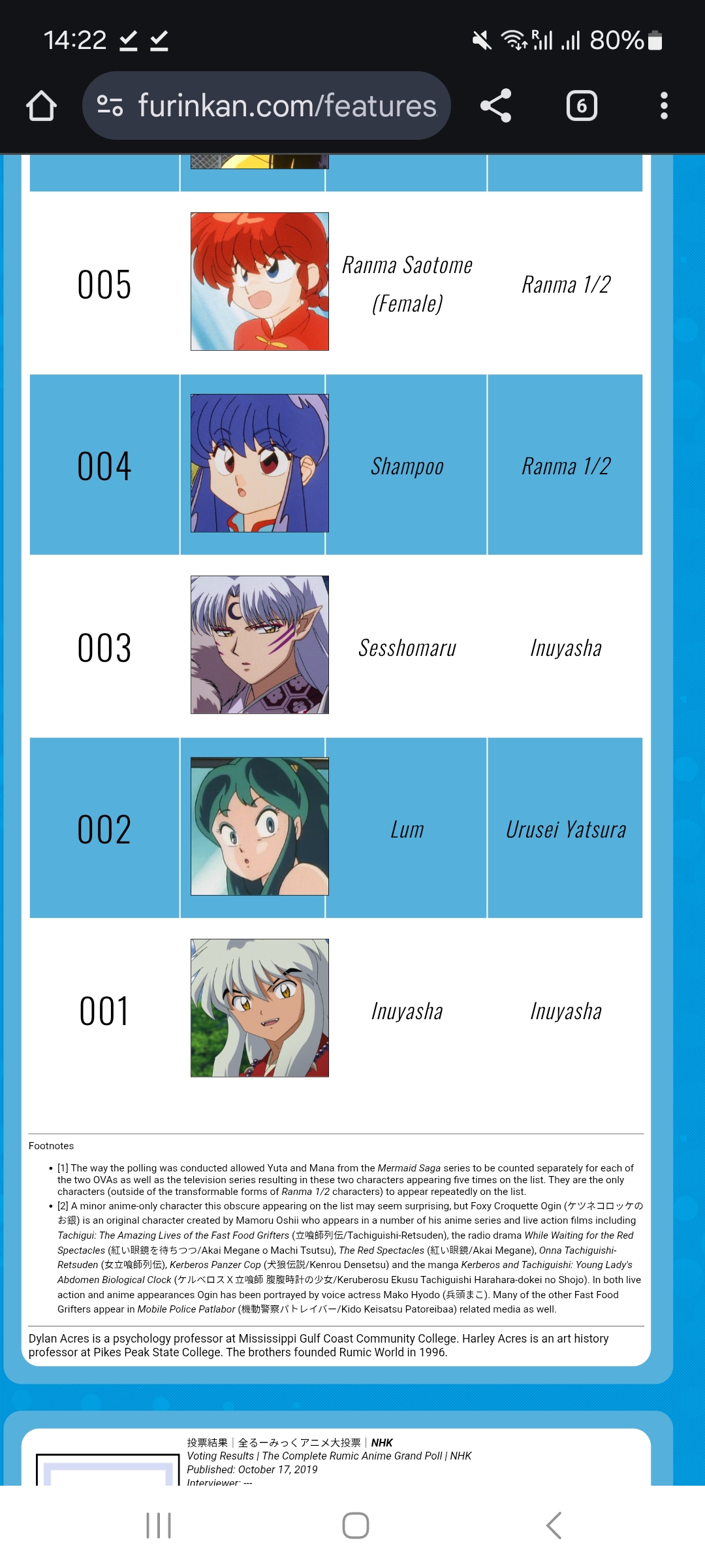i can't believe the ranking for p-chan is different than ryoga, i can understand female ranma and male ranma (not really but ok) but who likes p-chan without liking also Ryoga?
