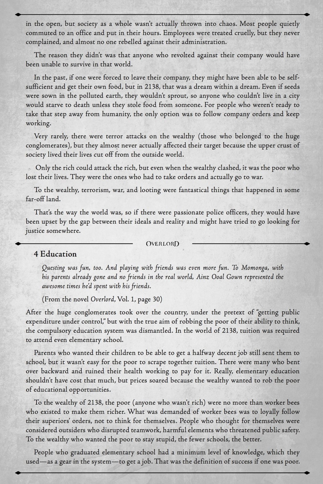 >>283318227>if they explained his undead emotion stop passive skillI do agree with this. I think it's too subtle about what's actually happening.It's not just emotion suppressing, but every time it happens, the man beneath looses a bit of ground and a bit of independence, to the role he's supposed to be playing. This is pretty observable at a few points, where immediately after the suppressor, he makes a call in line with what expectations others have of him, but if you aren't specifically looking for it, these can slide by. This is also, I think, a part where the anime makes for excellent supplemental material, because a few of the times it happens in the novel are very understated, just being breaks in train of thought, while they're obviously animated in the show.It doesn't just suppress emotion, it suppresses humanity, individuality, and independence. It makes him act more like Momonga, guild master of Ainz Ooal Gown, instead of a human.And the intentional parallel between this, and the slow conditioning of corporate culture also needs to be made a bit more explicit. I can blame some of this on just being a Japanese work, I suspect this is leaning on more conventionally understood social mechanisms within Japanese culture, and especially Japanese corporate culture, that aren't as obvious to anyone outside of that. The fukkin. That expression. "The nail that sticks out gets hammered down", something like that. The emotion suppressor is ALSO that social mechanism, just inside Ainz' head, and makes him conform to the role he holds instead of acting as he wishes. It's not entirely that, part of it is also the fact that Ainz is supposed to be unaware that it's happening, and it would be kind of awkward to have anyone else explain something going on within his psyche, so I can also understand why it isn't made more explicit. I think it would be worth some contrivance or clumsy narration to explain it better, but, I can understand it.
