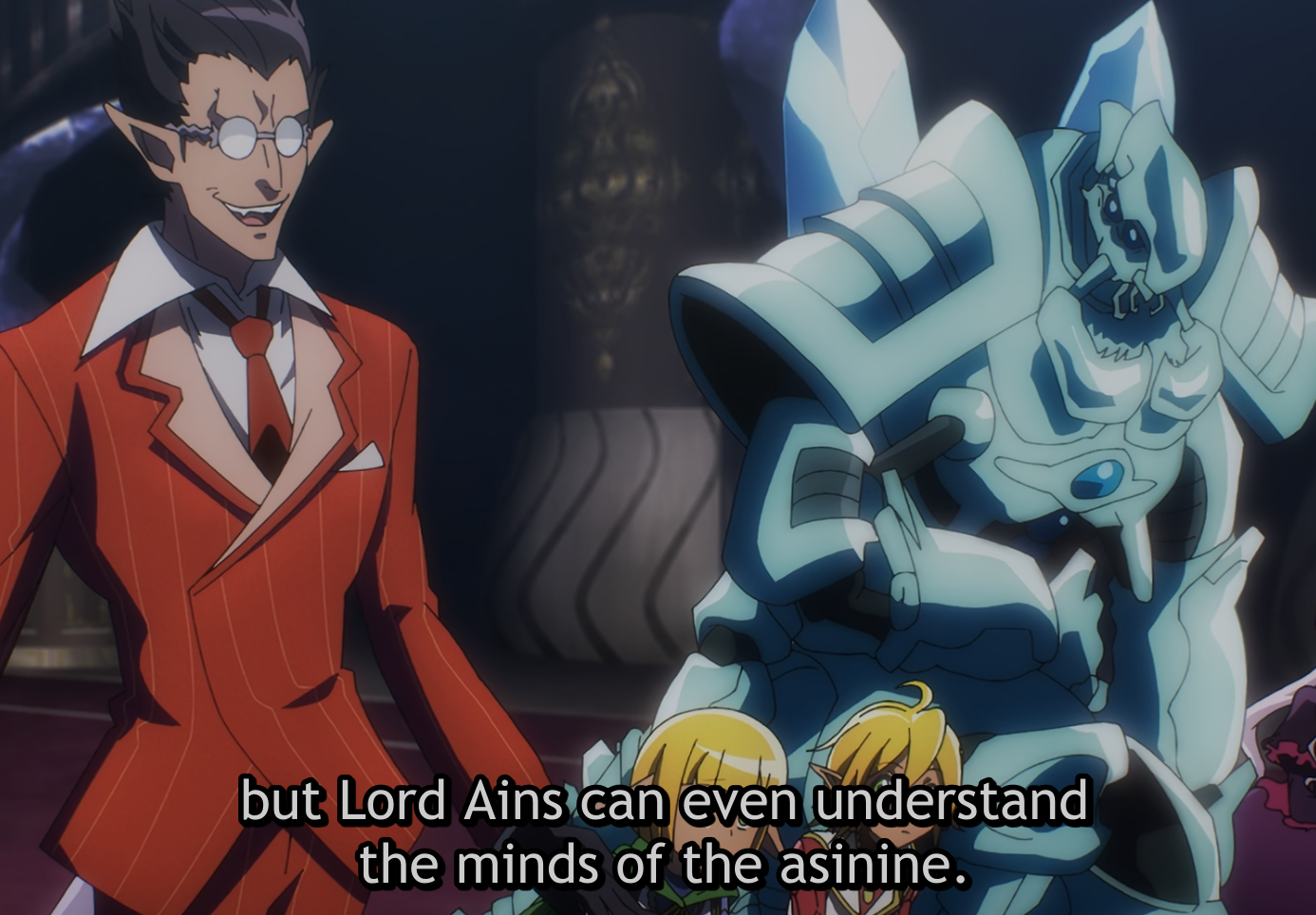 “But anon, what about Ainz’s goal to reunite with other players who found themselves in the same predicament?” Skeleton Knight actually emphasizes its protagonist’s goals though. You know the protagonist, what he wants, his likes and dislikes, and what is aiming for (at least for now.) I cannot say the same for Overlord, with its sparse, throwaway lines of his mentioning what is essentially a passing whim to maybe…perhaps…get in touch with other players at some point. The pacing—indeed, the episodes themselves are not really played out in a way that would give the audience a sense of an overarching goal or even a temporary motivation out of this half-baked, overgrown undead who just happens to have great fashion sense. (3/4)