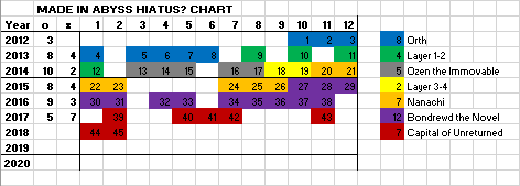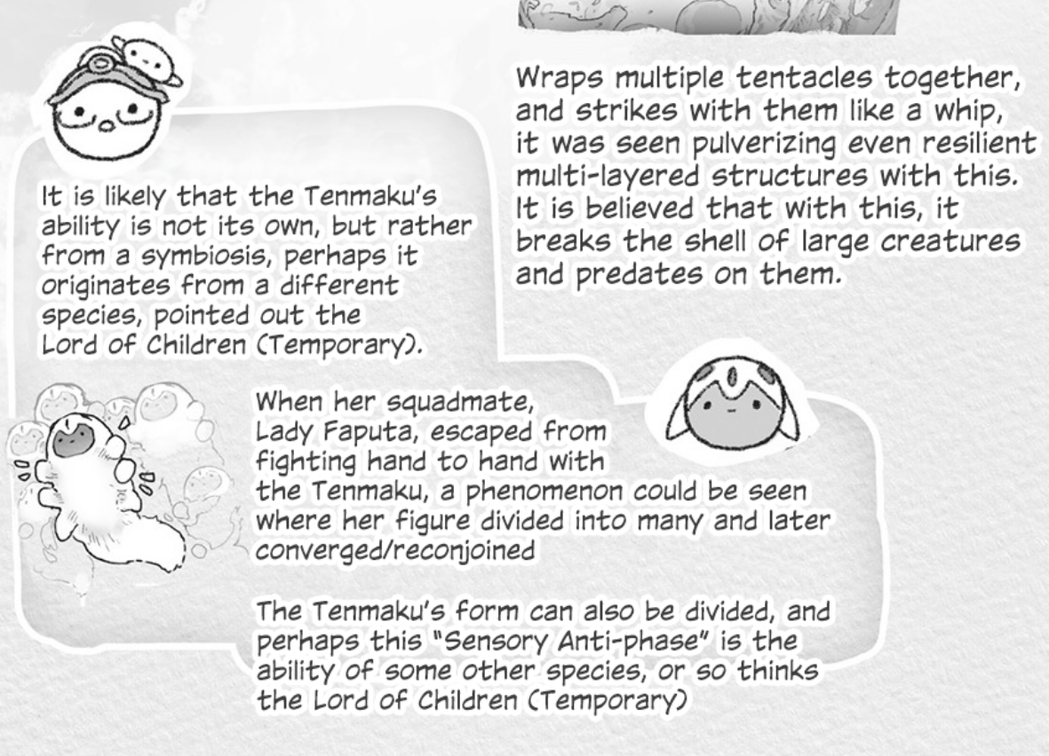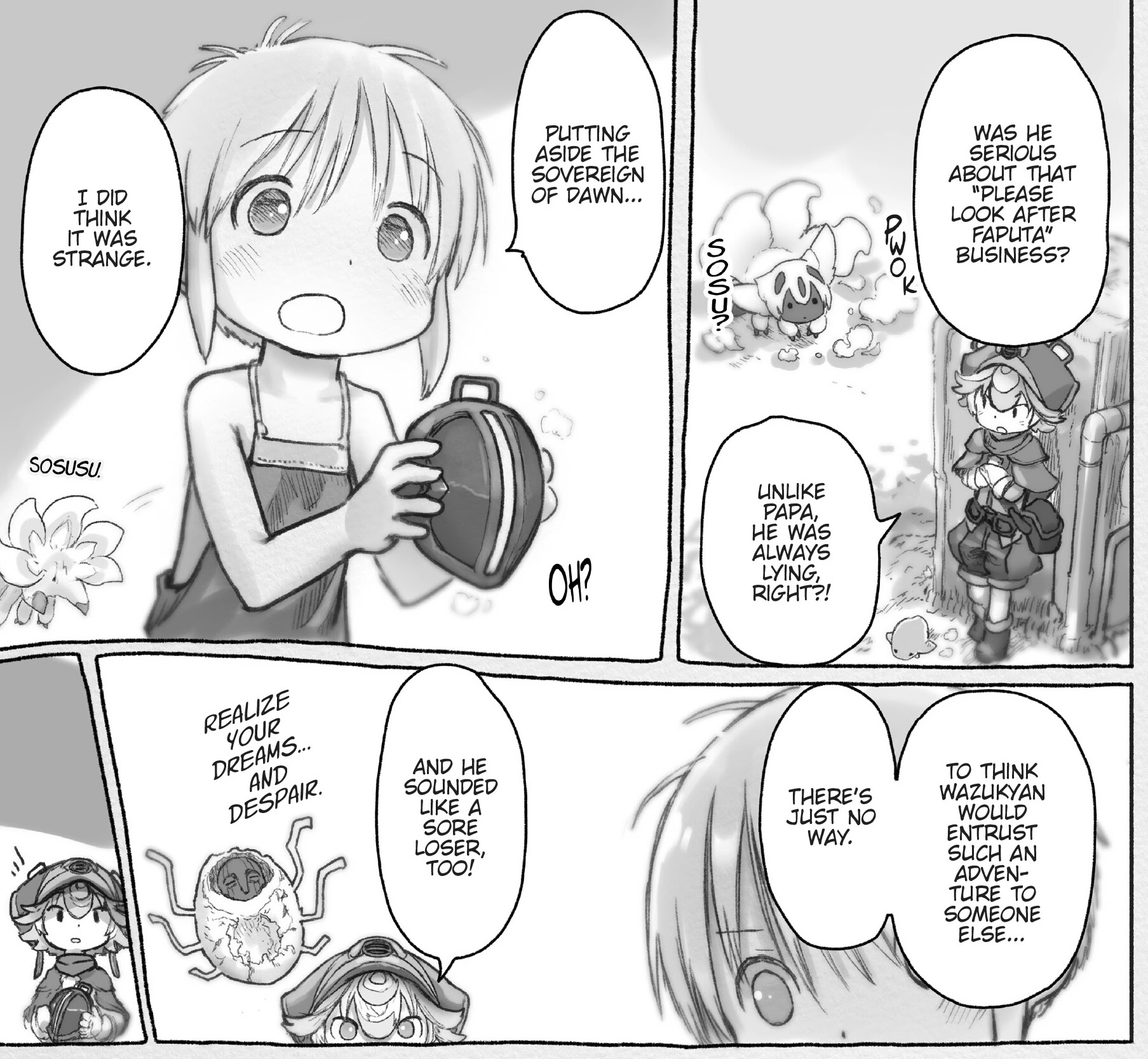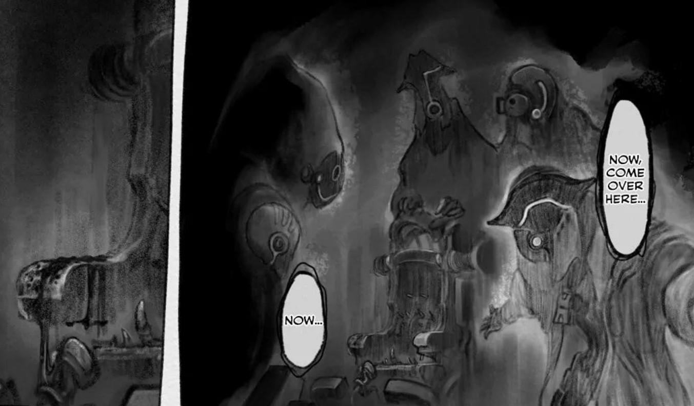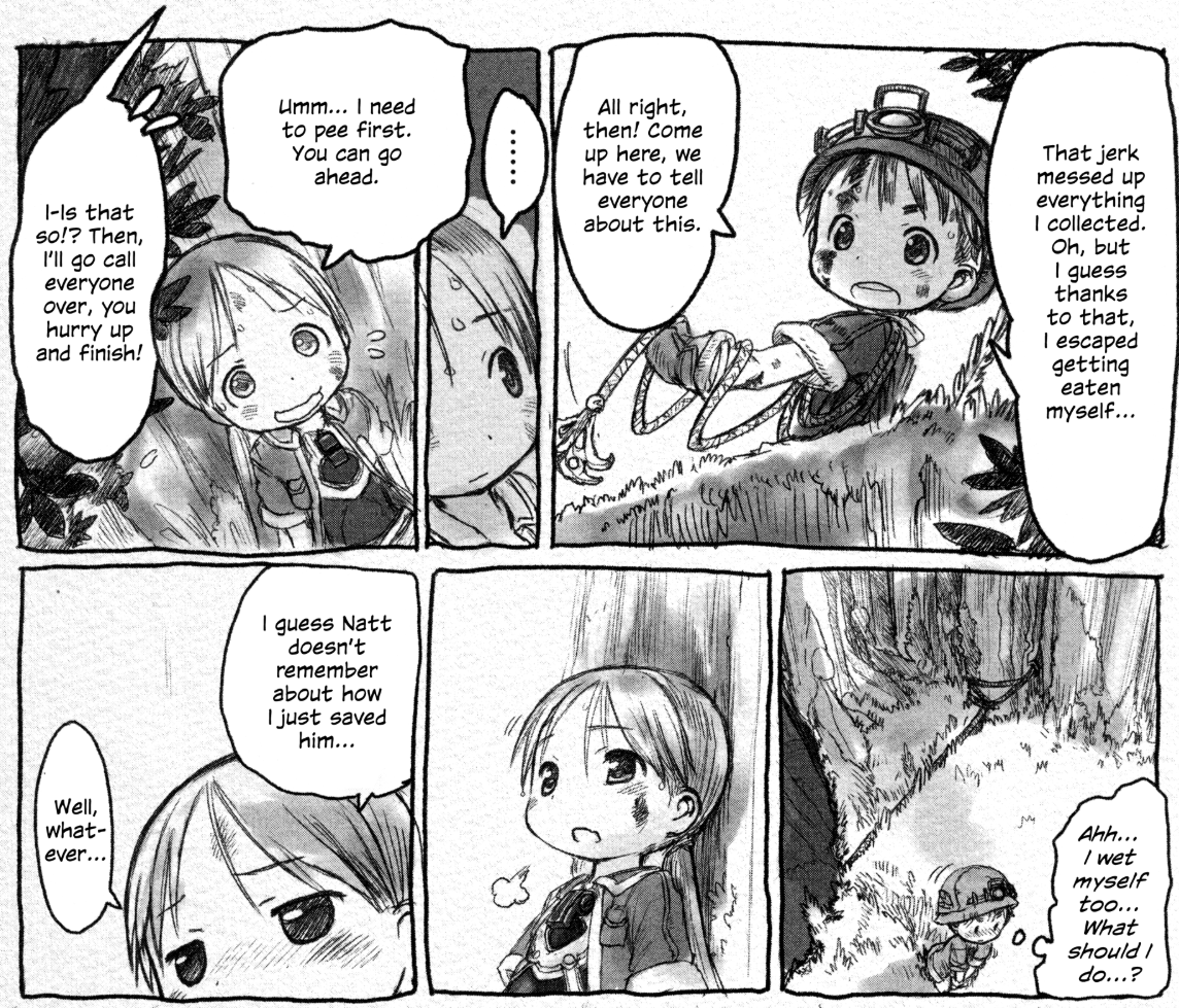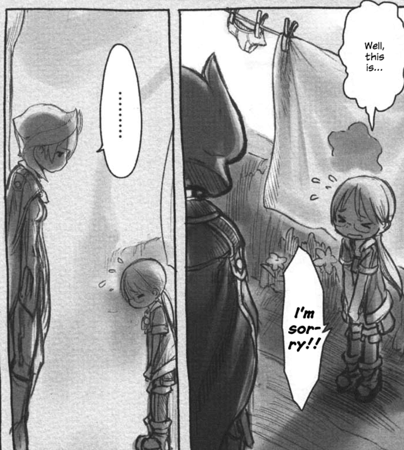 Tsukushi must be planning an exceptionally complicated confrontation further down the abyss, otherwise there wouldn't be much point in introducing Rimeyo.Speaking of which, how did Rimeyo not already catch up to Srajo? Is it because she's under orders to trail Srajo's team, maintain distance, and swoop in only while they are fighting the Miko...?How much does Bondrewd know about the deep abyss?