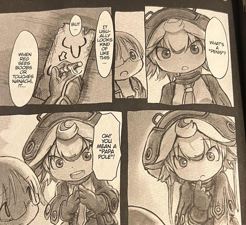 I had my parents bring me to Barnes and Noble for my birthday to pick up a bunch of the physical MIA manga volumes, and Volume 1 wasn't even wrapped in plastic. It was just there. I took them excitedly to the checkout counter, and the girl at the register put Volume 1 on top of the stack, SEAMLESSLY opened the manga STRAIGHT to the image of Riko strung up naked and slapped the receipt right there like she was bookmarking it for me.It was one of those young green-haired punky-looking girls with anime and manga-themed pins all over her jacket or shirt or whatever, too. I'm pretty sure I saw a Bleach pin and an Akatsuki/Anbu mask pin on there with like a Gengar or something on her getup. She didn't flip to it like, "Gee, how lewd," she opened STRAIGHT to it and looked deadass right at me and put the receipt there. Nobody said shit but I am 1000% sure everyone saw, she practically flashed the page. Less than a 1/160 chance of doing that at random.