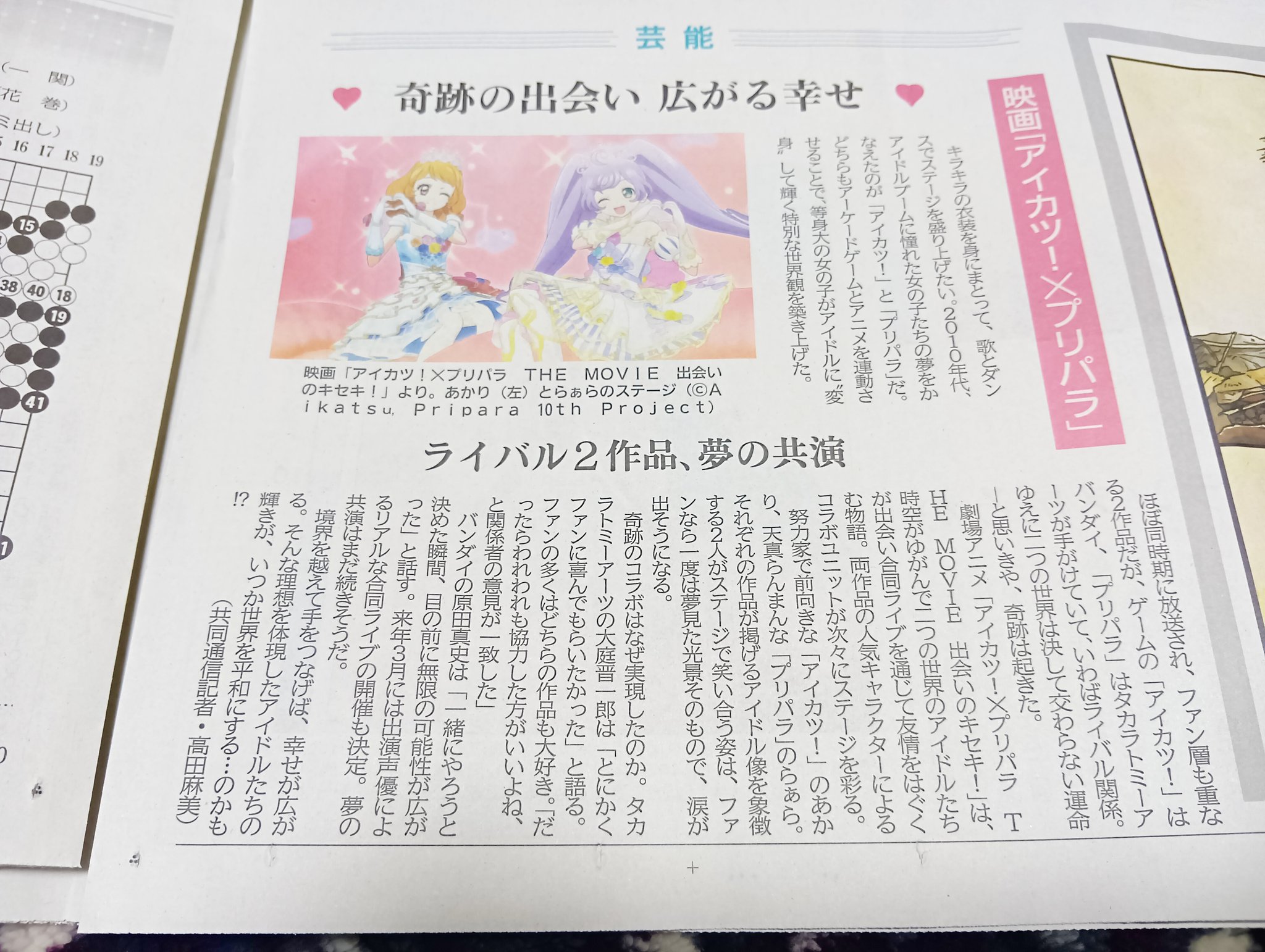Aikatsu x Pripara was in the newspaper because a collaboration between to rival works like this was so unheard of.>Ohba: We just wanted to make the fans happy, so everyone involved agreed that we should collaborate as well. >Harada: The moment we decided to work together, endless possibilities opened up before us.