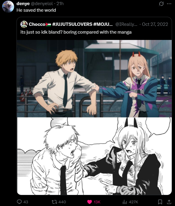 You guys dont remember JJK0 craze, literally all 14 year old girls world wide were going nuts, the fact that Chainsaw Man is on the same league as that is an amazing victory, our possible demographic is much much narrower