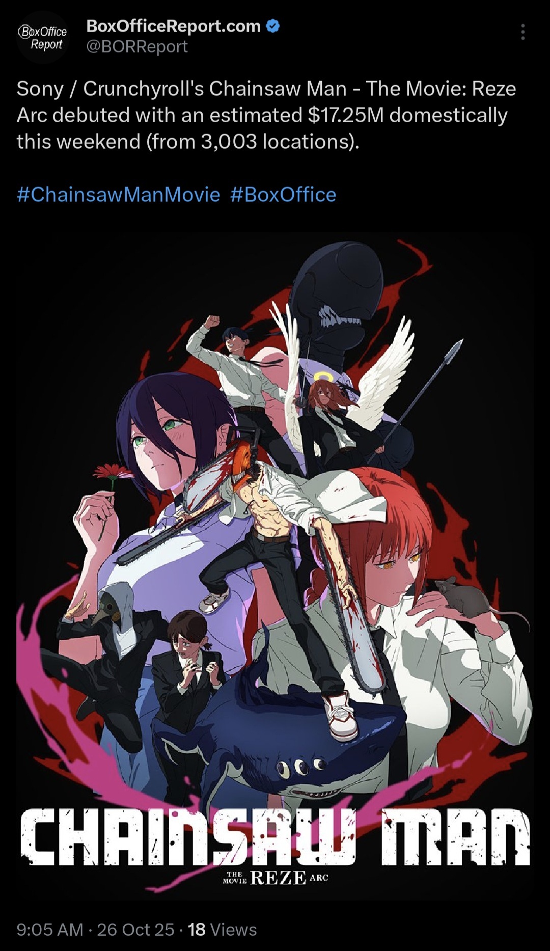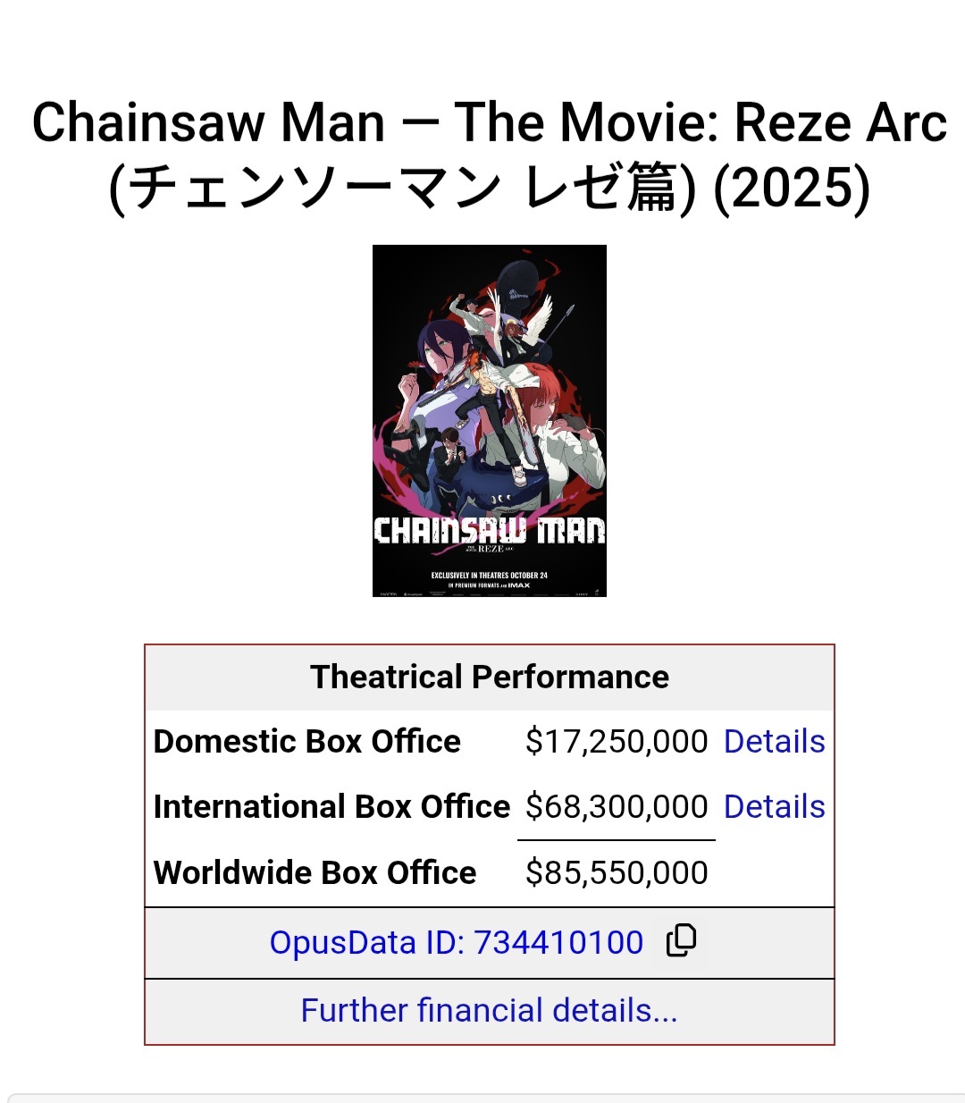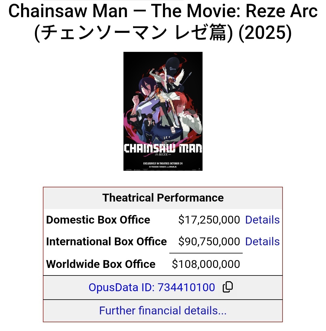 With $108 million grossed so far, Chainsaw Man Movie is now the 21st highest-grossing anime of all time.