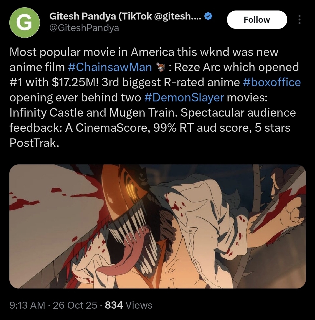Embarrassing how Chainsaw Man just walked in one month later and absolutely slaughtered all momentum Demon Slayer brought to anime cinema.