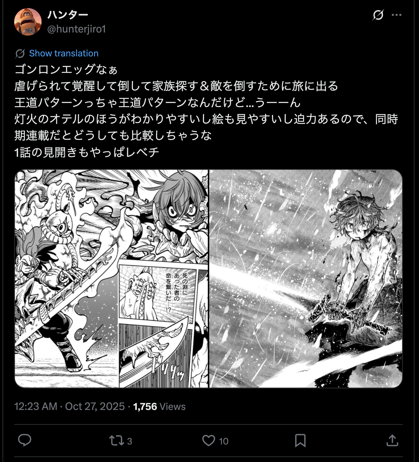 Gonron Egg, huh…It’s got that classic setup — gets oppressed, awakens, defeats the enemy, then sets off on a journey to find their family and take down the real foe. It’s a tried-and-true formula, I guess, but… hmm.Otr of the Flame is just easier to follow, the art’s cleaner and more impactful, so it’s hard not to compare the two since they started around the same time.Even the first chapter’s double-page spread is on a whole different level.