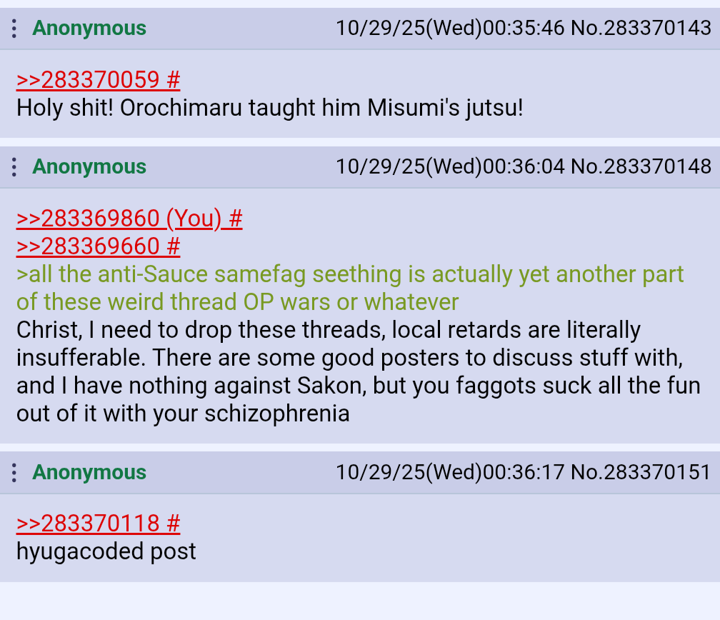>>283369860>>283369660>all the anti-Sauce samefag seething is actually yet another part of these weird thread OP wars or whateverChrist, I need to drop these threads, local retards are literally insufferable. There are some good posters to discuss stuff with, and I have nothing against Sakon, but you faggots suck all the fun out of it with your schizophrenia