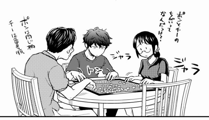 >>283371410Also, it’s not exactly a “highlight,” but personally, I really loved the little idea that Asako can actually play mahjong—not that she’s good at it or remembers all the rules perfectly, but she can play.I poured that fondness into the manuscript…but my editor, who’s never played mahjong before, didn’t get it at all, and I was like, “Tch…”A girl who normally seems totally disconnected from things like mahjong or horse racing joins in, even if she doesn’t know much, and little by little starts having fun — then she wins her first hand with a tsumo and excitedly goes, “Yay! I did it! It lined up!” — that kind of pure joy just makes me so happy…I didn’t get to draw a scene like that, but I wanted to put those feelings into this chapter’s family mahjong game.As for me, honestly, I only really started playing mahjong properly last year — I’m still a total beginner. When I was a kid, my grandpa had a mahjong table at his house, but I just used the tiles to build mazes and play around with them.