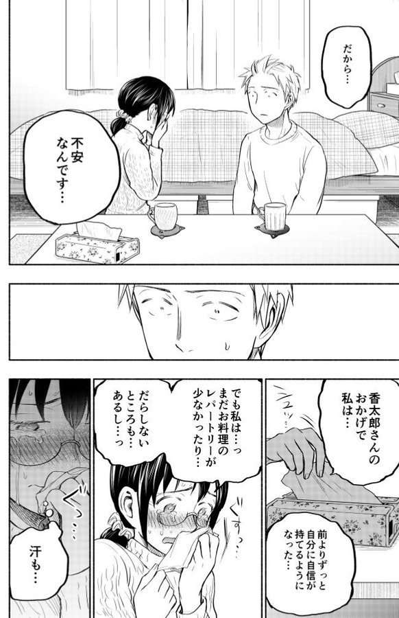 The highlight of Chapter 31 is the scene where Asako grabs a tissue to wipe her nose.Up until now, she’s shed quiet tears before, but this was her first time crying hard enough to almost sob—and when I thought about how to portray that, I realized I couldn’t imagine her crying beautifully like in a TV drama.But if I went full-on messy, with snot running everywhere, it’d be too distracting…So I settled on a restrained kind of crying—the kind where she’s fighting to hold it in.Tears keep her nose running, yet she refuses to collapse into sobs because she wants to express herself properly.That double layer of restraint felt so right.Once I decided that, no matter how tough the page layout got, I knew I had to include this scene.I even searched for reference images online and told the staff, “Please make the tissue box look like this cute kind,” giving very specific directions—then finally felt at ease.That’s how much care I put into this episode—and really, into this whole three-episode arc dealing with the cohabitation issue.Every line of dialogue took so much thought. I kept asking myself,“Why am I writing something this serious…? What happened to all the blushing scenes…?”Honestly, the only reason I wanted to draw Sweat and Soap in the first place was because I wanted to show a plain glasses-wearing office lady blushing like crazy.To think it’s grown into a story that asks questions like “What is life?”—it’s kind of overwhelming.Next week’s chapter, though, is a soft, easygoing, affectionate one—like the author’s tension has completely snapped—so I hope you’ll read it while relaxing in bed.
