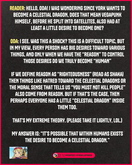 >>283436554No. But I would ask Oda if he had never gone ahead and rewritten the Romance Dawn one-shot into what we know as One Piece what kind of manga he would write. Doesn’t have to be specifics on the story itself but general direction/themes. Knowing Oda it would probably be a harem comedy.