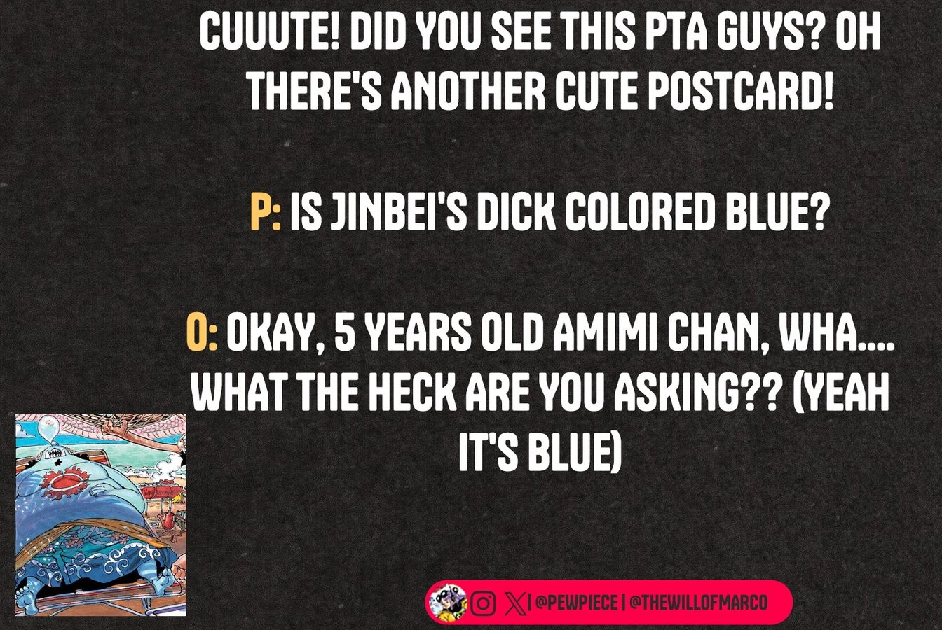 >>283436343>Throughout all the SBS Oda confirmed that Jinbe has two shark dicks that are blue