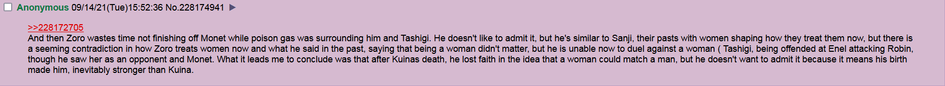 >>283436543No strawhats will get an arc like Sanji did. YOu should be happy that Robin got some chapters in Elbaph, but basically people like Zoro and Franky are done for and won't get anymore development or background story that matters.