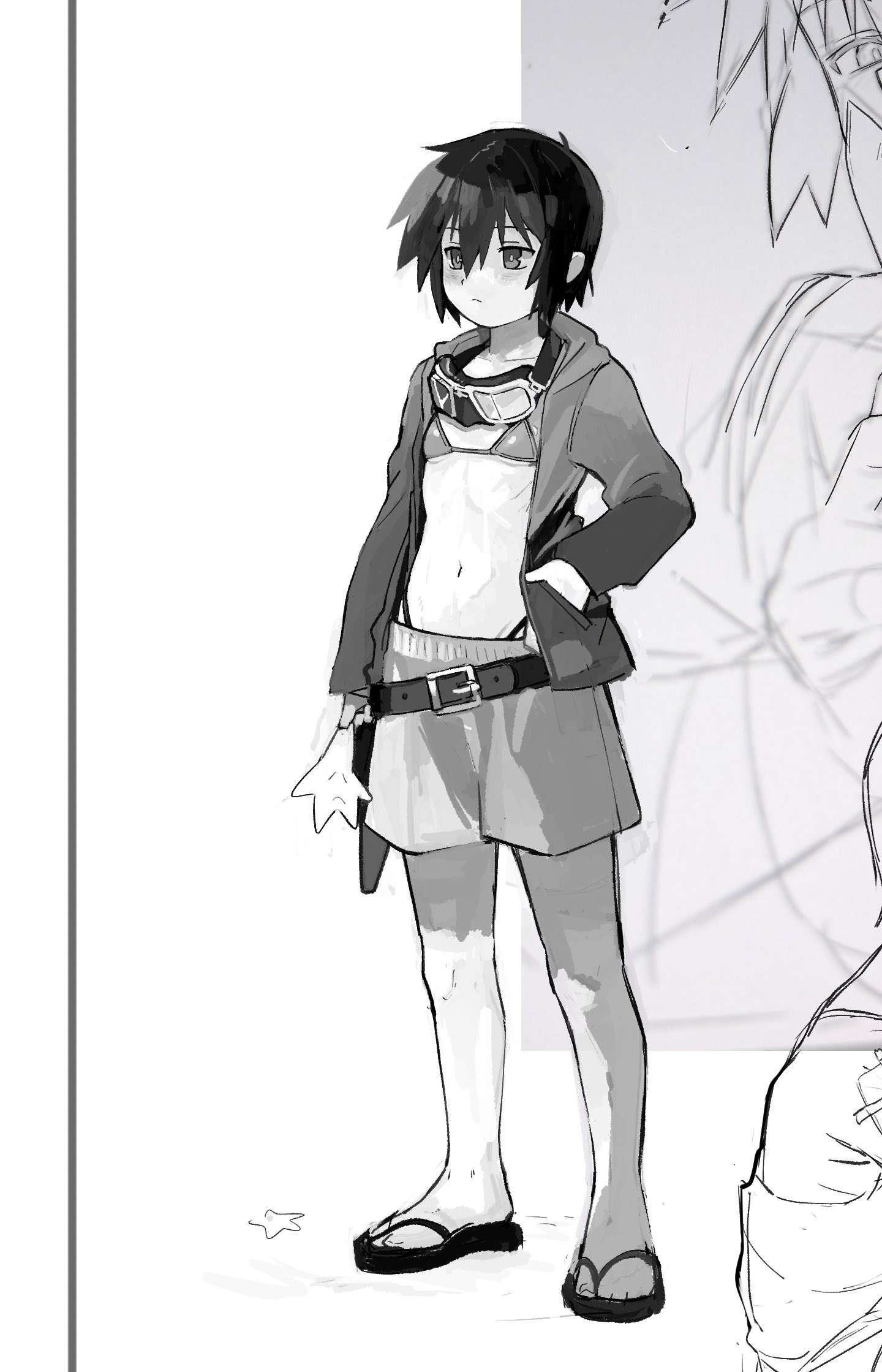 Nothing weird going on here, just a boy in boy's swimming trunks.