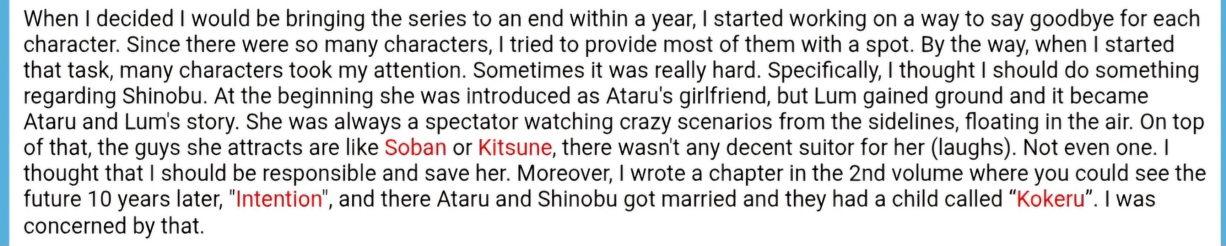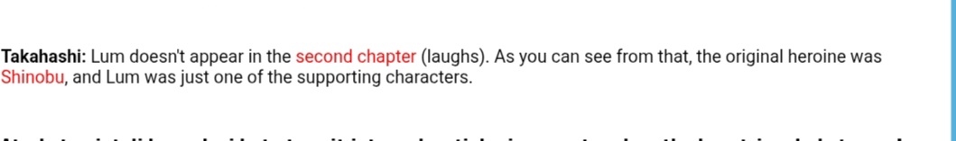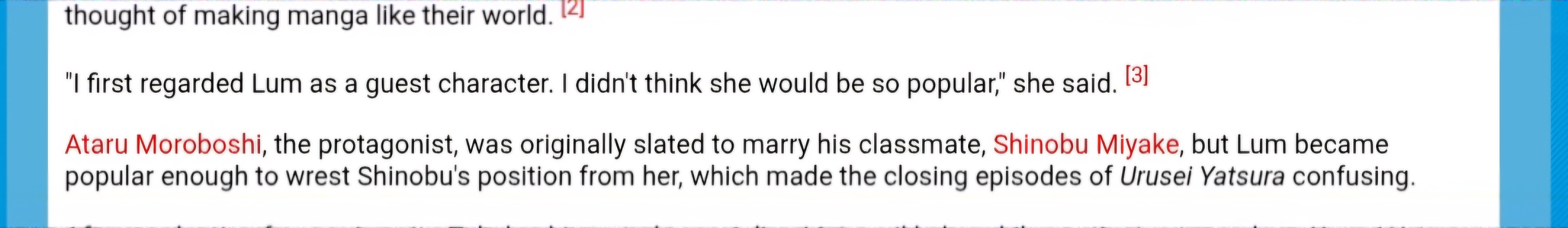 >>283498794>All you need is Rumiko (or anyone who worked with her) saying something like "Lum was popular with fans so I made her the heroine" but you have nothing.Yeah the fucking manga switching the heroine is nothing lmao, and also the publisher literally saying she should keep using the lum, and Makoto Oshima her editor also said to keep Lum because she was what draw viewers in.Observable fucking reality is not believable because you are a cuck who can't handle his image of the author being dirtied.Her self insert Shinobu is memory holed and she probably will always be seething about it.