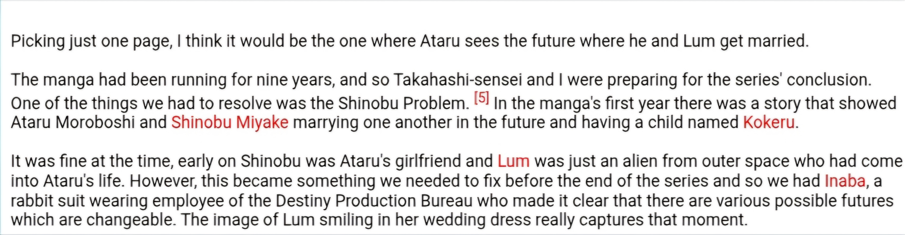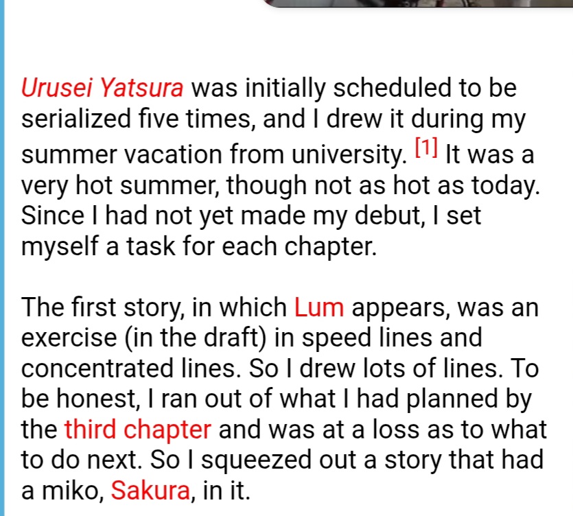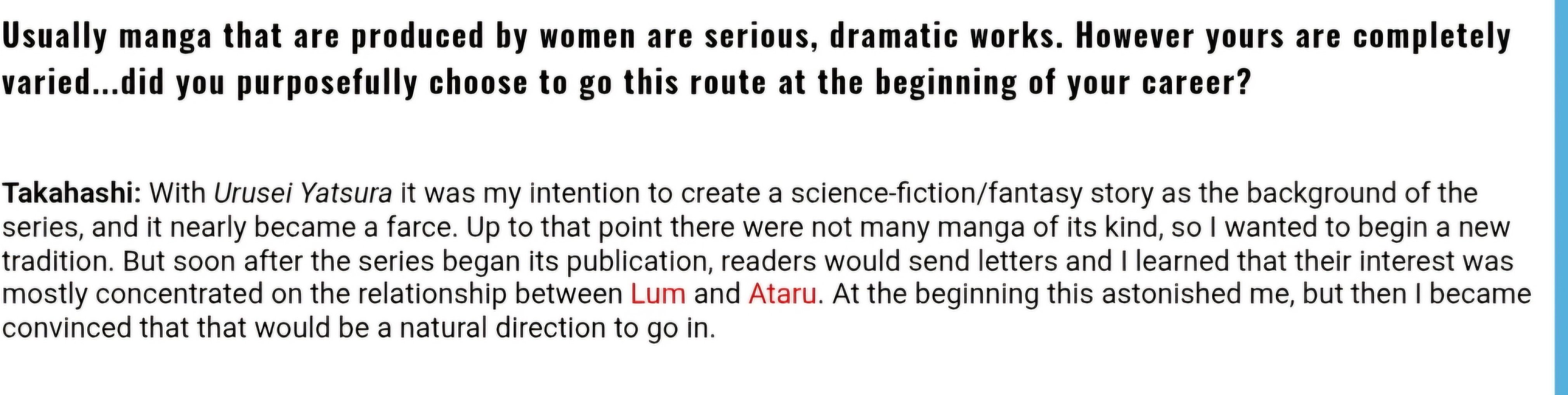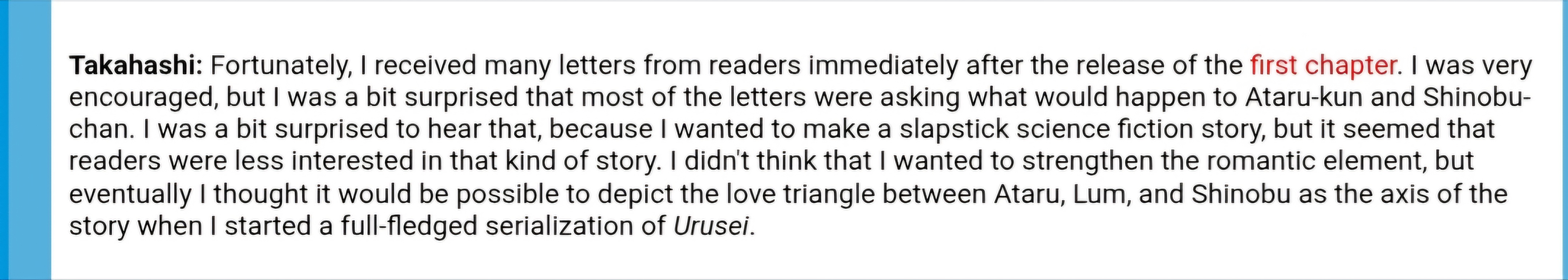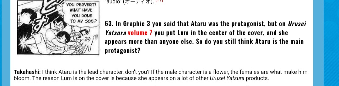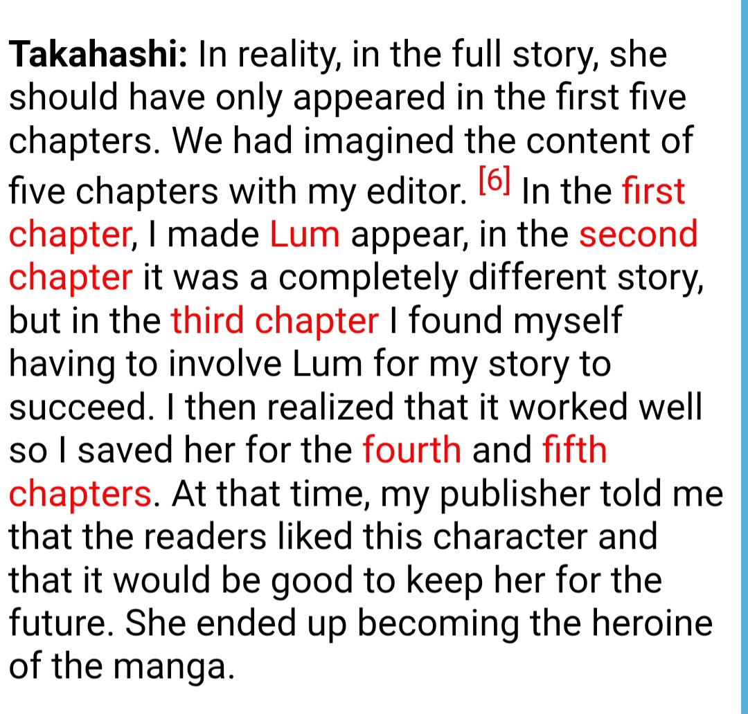 >>283492906The screenshot you posted literally says>in the third chapter I found myself having to involve Lum for my story to succeedYour own evidence proved you wrong lol.https://www.furinkan.com/takahashi/takahashi31.html>But I got stuck on the storyboard for the third chapter, and I couldn’t go forward so I thought I could use that girl, and she appeared again.Also you said>fan letters wanting more about the love triangle between Lum and Atarubut last I checked it takes three to make a love triangle and you surreptitiously left out Shinobu as if that would prove your point.https://www.furinkan.com/takahashi/takahashi50.html>Ataru, Shinobu and Lum became the axis of that original five chapter story. It wasn't until the end of the [five chapter] series that I learned that the manga was a big hit. The three of them were loved by the readers, and I heard that "many people are wondering what this love triangle will be like." When it was decided to go ahead with a long-term serialization, I decided Lum would appear in the on-going series.https://www.furinkan.com/takahashi/takahashi77.html>I was very encouraged, but I was a bit surprised that most of the letters were asking what would happen to Ataru-kun and Shinobu-chan. I was a bit surprised to hear that, because I wanted to make a slapstick science fiction story, but it seemed that readers were less interested in that kind of story.Nice try schizo. You can impotently rage at Rumiko all you want and it won't make any difference.