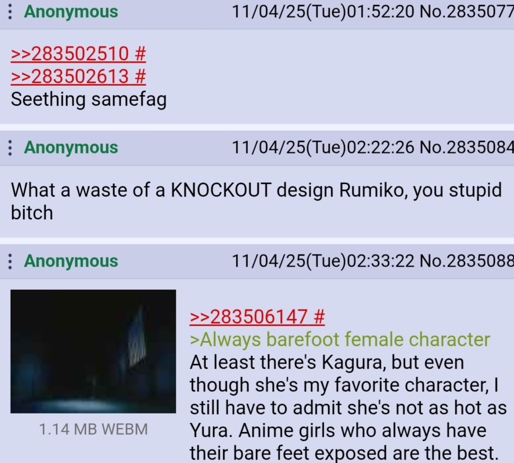 >>283507737aren't you the seething fag that got btfo?neither is me>>283507173because I am right.Kagome has the most haters in Japan, not in the west https://medaka.5ch.net/test/read.cgi/cchara/1459513560?>"she got popular"ESL reading comprehension bro...It means Lum gained ground in the story/romance with Ataru. No zoom zoom, since the post was about popularity and not story context and "gained ground" in that context literally meant to become popular, since after that line she said "alas she became the heroine"Manipulating things this much doesn't do you any good since anyone not retarded can see what happened.