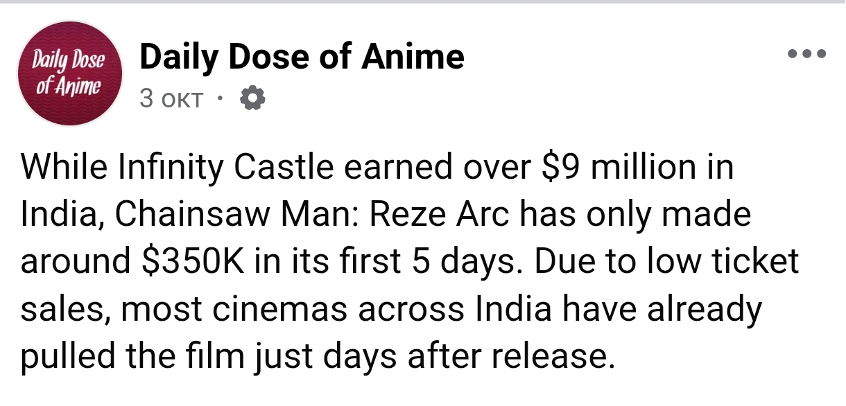 >>283484676>>283484652>While Infinity Castle earned over $9 million in India, Chainsaw Man: Reze Arc has only made around $350K in its first 5 days. Due to low ticket sales, most cinemas across India have already pulled the film just days after release. >Reze Arc had decent hype before launch, but it struggled at the box office for several reasons. The movie received an ‘A’ rating in India, which blocked a large part of its teenage fanbase. >Most theaters showed it on fewer screens, especially compared to Infinity Castle which had over 750 screens and strong pre-booking interest. >The long 3-year gap between the anime’s first season and this movie also cooled off the hype. >And unlike flashy, fast-paced anime films like Jujutsu Kaisen 0 or Demon Slayer, Reze Arc had a slower, more emotional tone in the first half, which may not have matched what casual Indian viewers expected from a shounen film. >The movie is still doing well in Japan and hasn’t flopped overall, but its India release has definitely disappointed many Chainsaw Man fans.