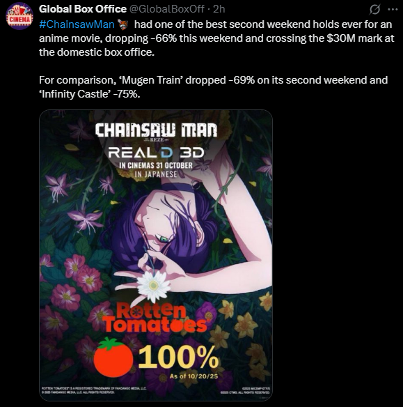 >ChainsawMan reacts over the weekend after a weak Halloween FRI, beating DragonBall Super Broly as the #6 highest grossing anime film ever at US Box Office>It hits a 30.8M cume in the US, beating #DragonBallSuperBroly’s entire 30.7M run only next week as the #6 HIGHEST GROSSING anime of all time!>Eyeing a 40M-45M run in the U.S.