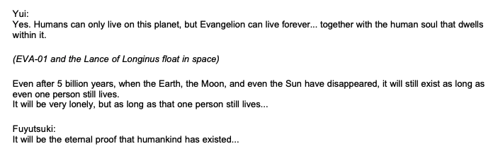 The internet is an interesting thing, because it perpetually allows a specific culture to exist unto infinity. We've had the Rei vs Asuka argument for 31 years now. We will likely continue to have it for the rest of our lives. Neon Genesis Evangelion will remain relevant for like a century after it was made. Will it still remain relevant, a century, two centuries later? Will people in the future still watch it and get into the Rei vs Asuka argument? Will this culture persist, and if so how long?Imagine people three hundred years in the future watching Eva for the first time. It's still perfectly preserved. They learn the ear worm A Cruel Angel's Thesis. They see Shinji's struggles. They see Evas battle Angels. A series made centuries ago, still watched and discussed as if it were made just a few years ago. Imagine.