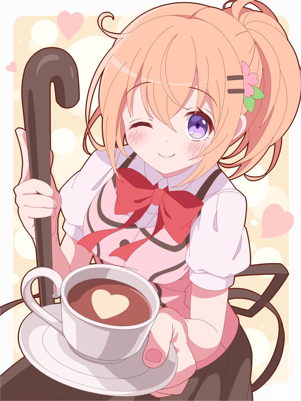 Cocoa is introduced as a 15-year-old girl with orange mid-length hair, purple eyes, and a cherry blossom hair accessory. She is a bubbly and optimistic girl who claims to be able to make friends in three seconds, although she is often careless and has no sense of direction. She moved to town to study at a high school and stays in the Kafuu residence. She began helping out at the Rabbit House to pay for her accommodation. Although she cannot distinguish the taste of coffee, she is able to work as a waitress. Cocoa is the youngest of four siblings and admires her older sister Mocha, who gave her a hair accessory (in which she has the other half). She treats Chino like a little sister so that Chino has an older sister figure to look up to, just as Cocoa does with Mocha. Due to all the people she has met in her life, Cocoa dreams of becoming an international barista lawyer with her own bakery. She even wants to be a part-time novelist (not to mention her younger self wanted to be a magician). Her name is a reference to hot chocolate (ホットココア, hotto kokoa).