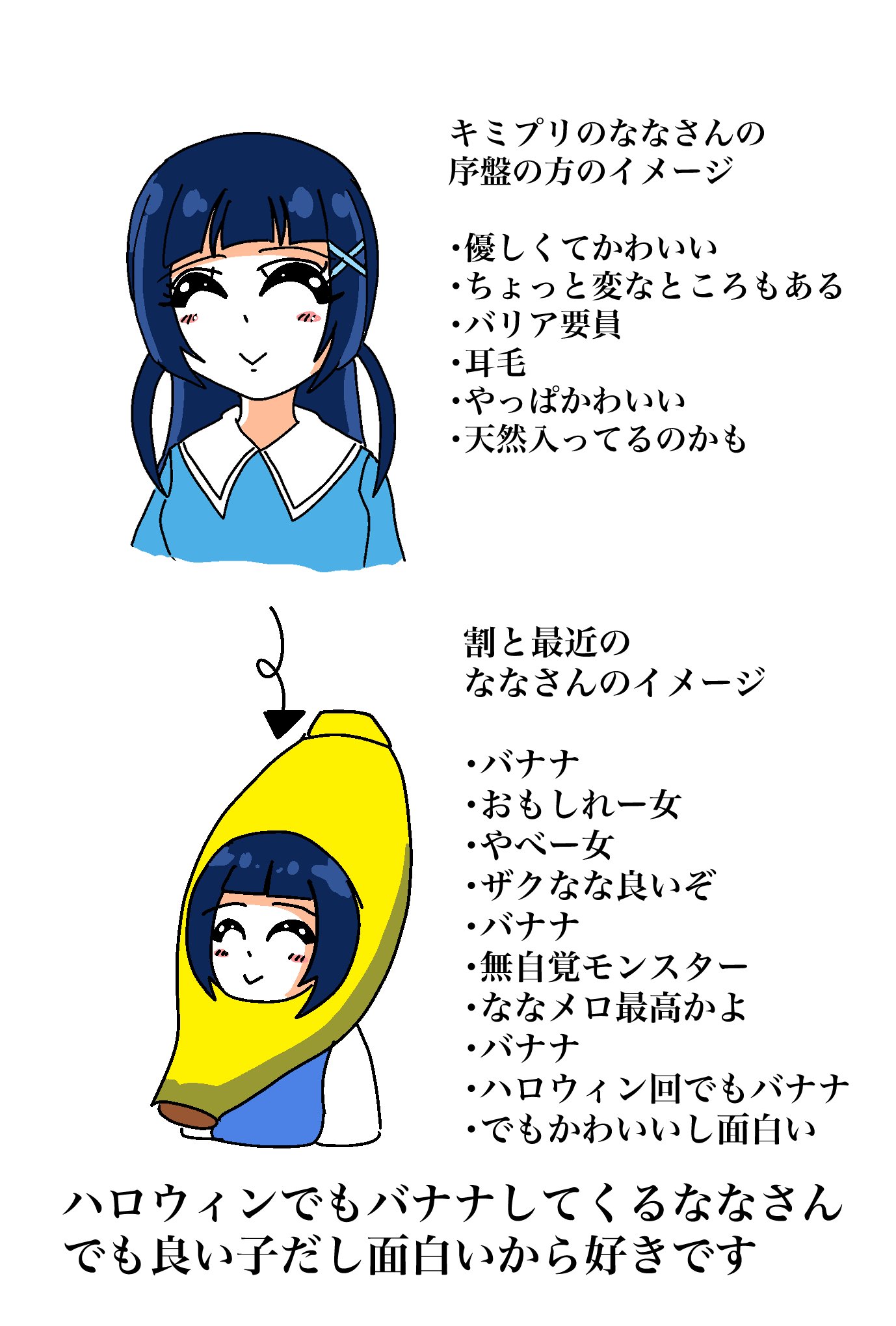 >>283615341>Early impression of Nana-san from KimiPre>sweet and cute>a little weird>barrier Cure>ear hair>still cute>possible airhead>More recent impression of Nana-san>Banana>Funny girl>Crazy girl>ZakuNana is good>Banana>An unaware monster>NanaMero da bes>Banana>Halloween ep also banana>But cute and fun>Nana-san was bananas even in the Halloween ep, but she's a good girl and it's fun so I love it.