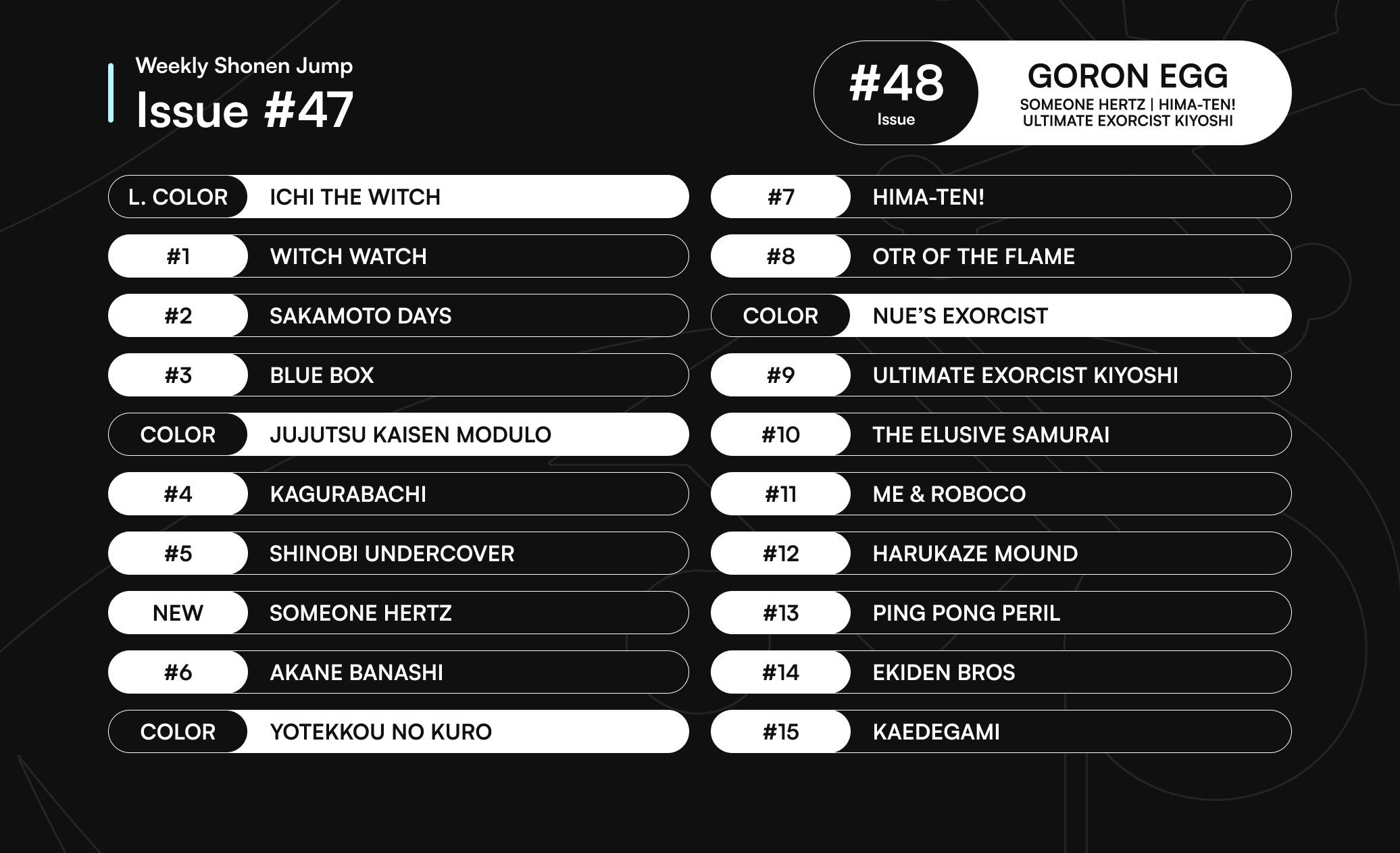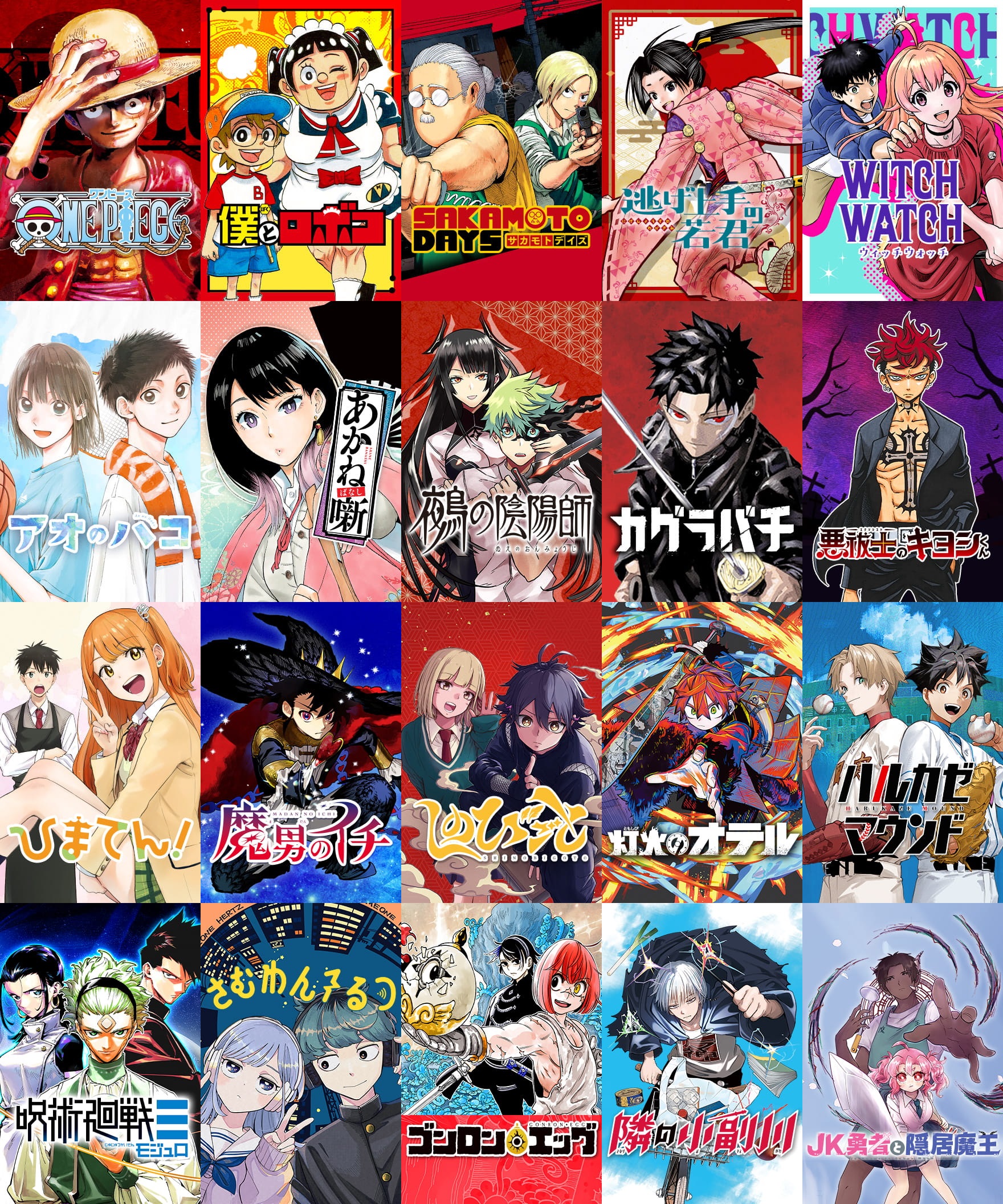 >>283681834One PieceSakamoto DaysElusive SamuraiWitch WatchBlue BoxAkaneNueKagurabachiIchiModuloSomeone Hertzeverything else deserves to be axed