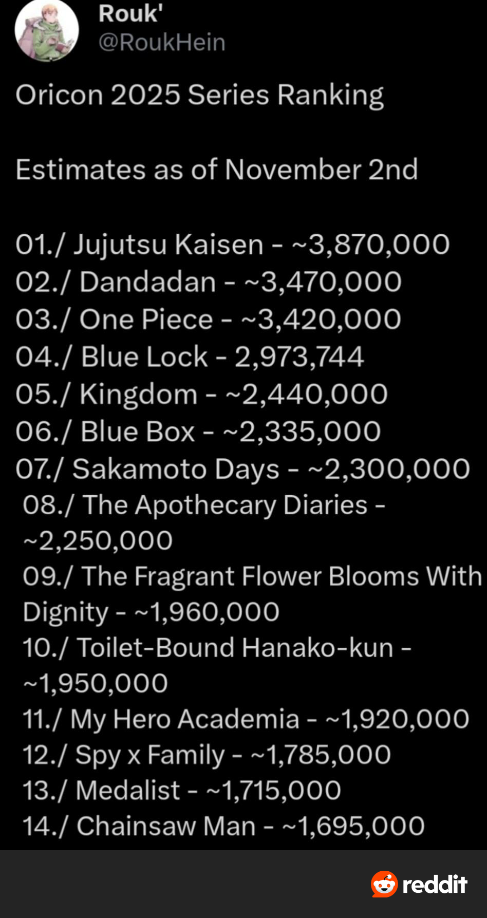 Weekly Shoseki Top 500 (11/3/25 - 11/9/25)1. One Piece #1132. Ruri Dragon #4 (TRASH}6. Akane-banashi #1915. Nue's Exorcist #1222. Shinobi Undercover #524. Hima-Ten! #630. Kill Blue #12 (9,350)34. Ultimate Exorcist Kiyoshi #6 (8,800)35. Me & Roboco #24 (8,662)100. Harukaze Mound #1 (3,950)155. Kaedegami #1 (3,015)159. Otr of the Flame #2 (2,947)219. Ping Pong Peril #1 (2,107)Ruri so fucking shit
