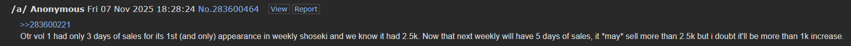 >>283694733Weekly Shoseki Top 500 (11/3/25 - 11/9/25)1. One Piece #1132. Ruri Dragon #4>AXE LINE6. Akane-banashi #1915. Nue's Exorcist #1222. Shinobi Undercover #524. Hima-Ten! #630. Kill Blue #12 (9,350)34. Ultimate Exorcist Kiyoshi #6 (8,800)35. Me & Roboco #24 (8,662)100. Harukaze Mound #1 (3,950)155. Kaedegami #1 (3,015)159. Otr of the Flame #2 (2,947)219. Ping Pong Peril #1 (2,107)Ekiden Bros & Nice Prison didn't chartfixedAnything below a SoL is a diagrace foe a SHONEN Magazine