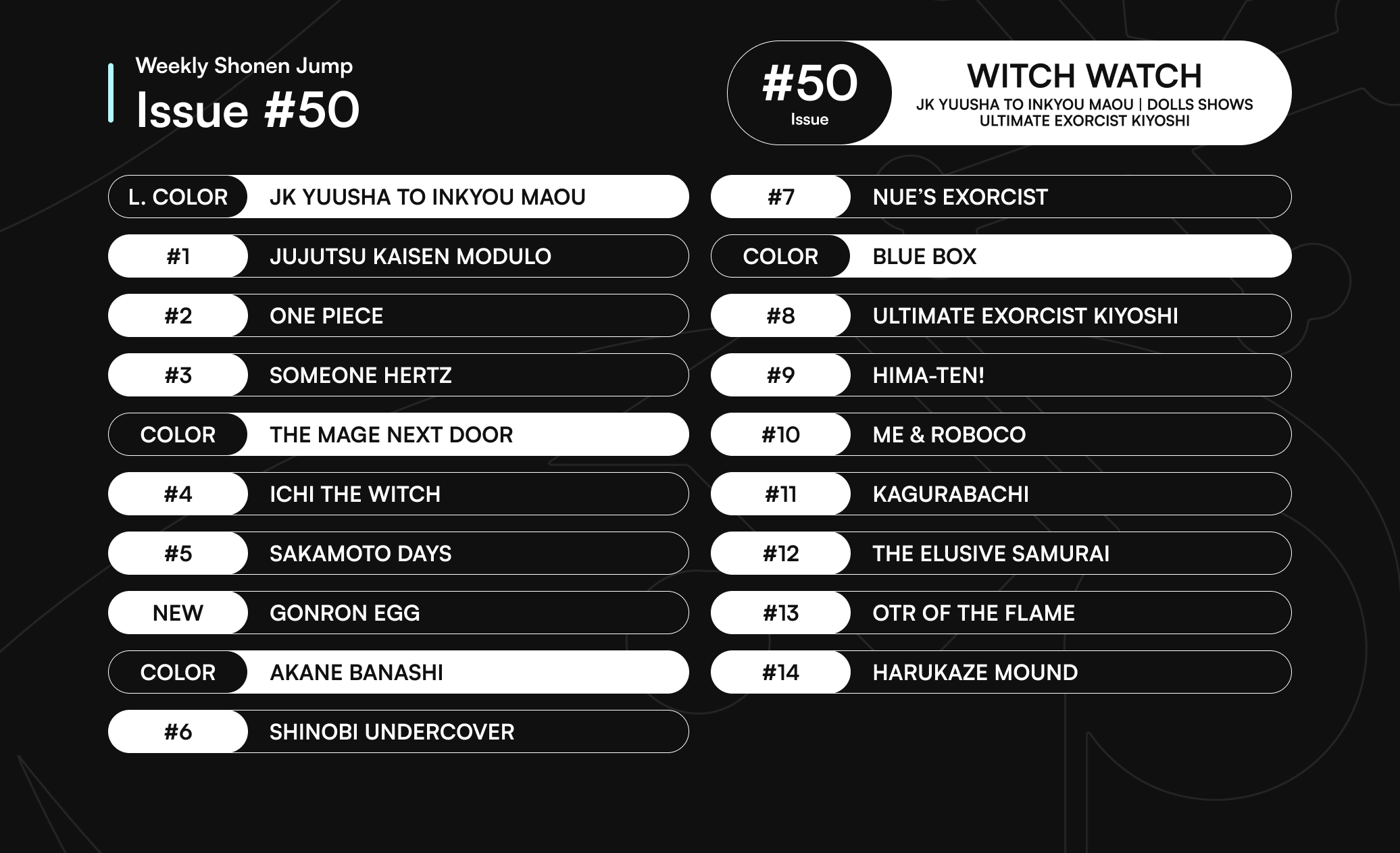 Blue Box thread: defended till page 10Jujutsu Kaisen Modulo thread: defended till page 10Kagurabachi thread: defended till page 10Otr thread: died with 276 postsIchi thread: died with 234 postsGonron thread: died with 147 postsThe Elusive Samurai thread: died with 144 postsNue thread: died with 143 postsHero Girl Demon Lord thread: died with 137 postsAkane thread: died with 83 postsSomeone Hertz thread: died with 75 postsShinobi thread: died with 60 postsHimaten thread: died with 44 postsKiyoshi thread: died with 39 postsMage Next Door thread: died with 39 postsSakamoto thread: died with 35 postsHarukaze thread: wasn't dumpedRoboco thread: wasn't dumpedWitch Watch thread: on break