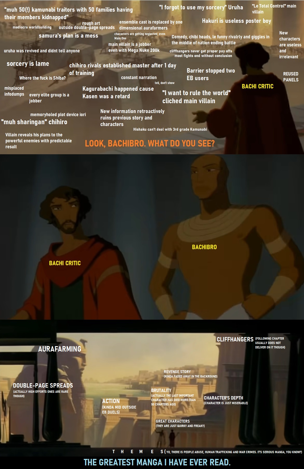 >>283730351The only valid criticisms in that pic are:>mediocre worldbuilding>rough art>reused panels>cliffhangers never get proper payoff>tell, don't showThe rest is either speedreader retardation or normal storytelling technique.