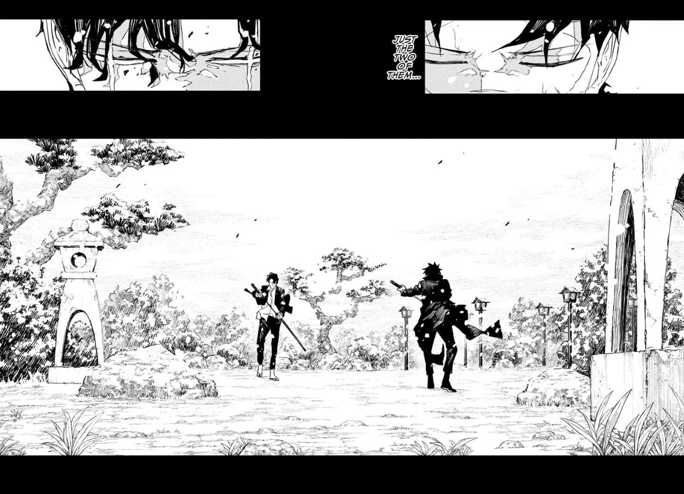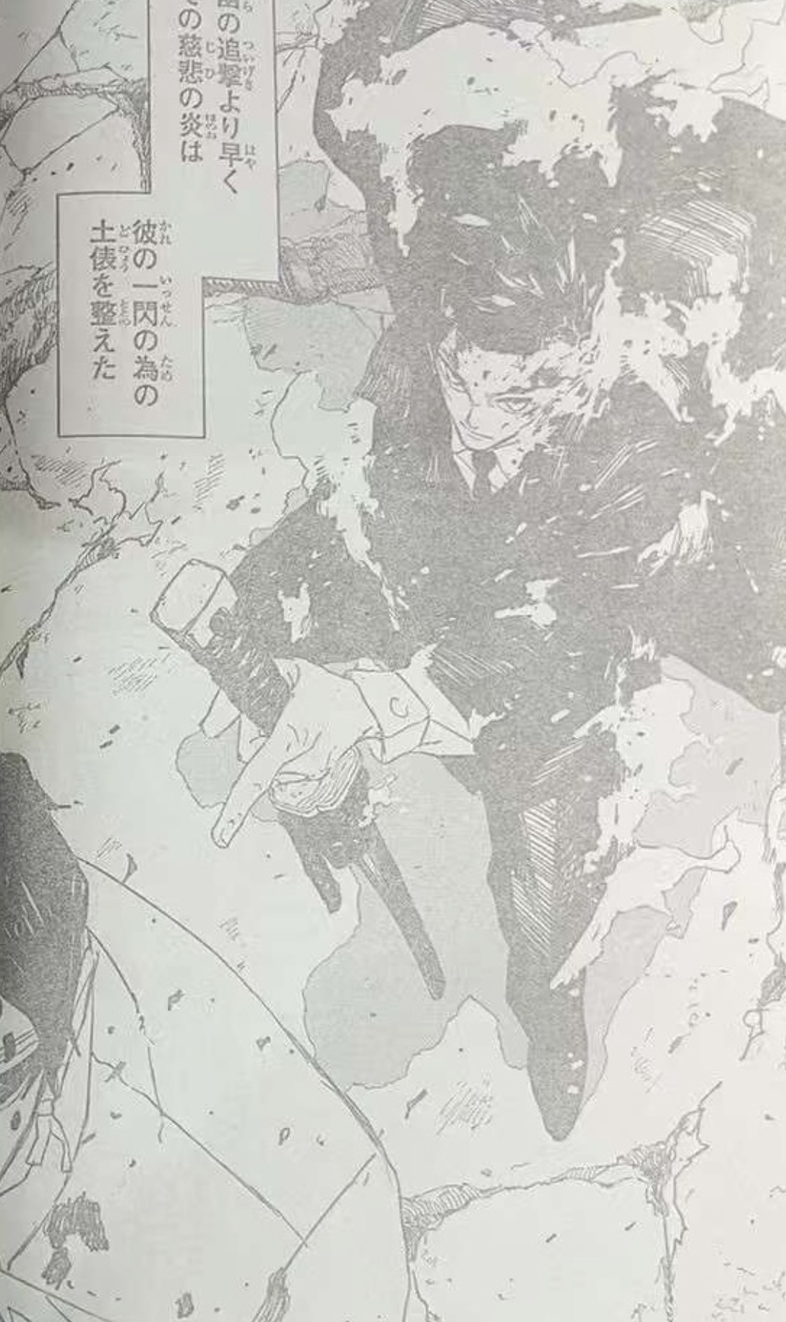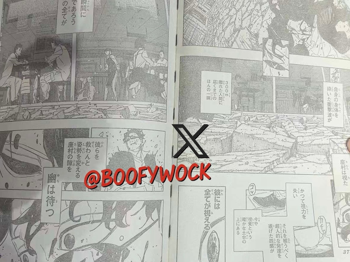 >>283892869>Yura: Mukade>>283892878>Samura: !!!>Samura thoughts: This is close>Samura thoughts: to the Sword Saint's from 18 years ago.>>283892897>Narrator-kun: The wave of force that breaks one's body>Narrator-kun: expanded out to people 300 meters away in just a second.>Narrator-kun: Samura sees it.>Narrator-kun: He once lost his vision>Narrator-kun: and developed his remaining four senses to superhuman levels.>Narrator-kun: Now they are supported upon the solid foundation that his is his vision.>Narrator-kun: He can see everything.>Narrator-kun: Even if it is just an instane, he sees it all.Top of the page is cut off, so I'm going off of context here.>Narrator-kun: Yura waits for the moment when Samura changes his stance>Narrator-kun: to go protect those people.>>283892903>Shiba: Stay focused.>>283892913>Shiba thoughts: Samura, seems your eyes have been dealt with.>Shiba thoughts: I will get everyone out. You just>Shiba thoughts: see what you need to se!!>Narrator-kun: The man that was there>Narrator-kun: Even while he flesh and bone were broken,>Narrator-kun: Those red eyes did not move even a millimeter away from his enemy in front of him,>Narrator-kun: and he held onto his katana.>Flashback Chihiro: I will break Shinuchi.>Flashback Chihiro: You will heal the wounds that I receive from here on.>Samura: Suzaku.