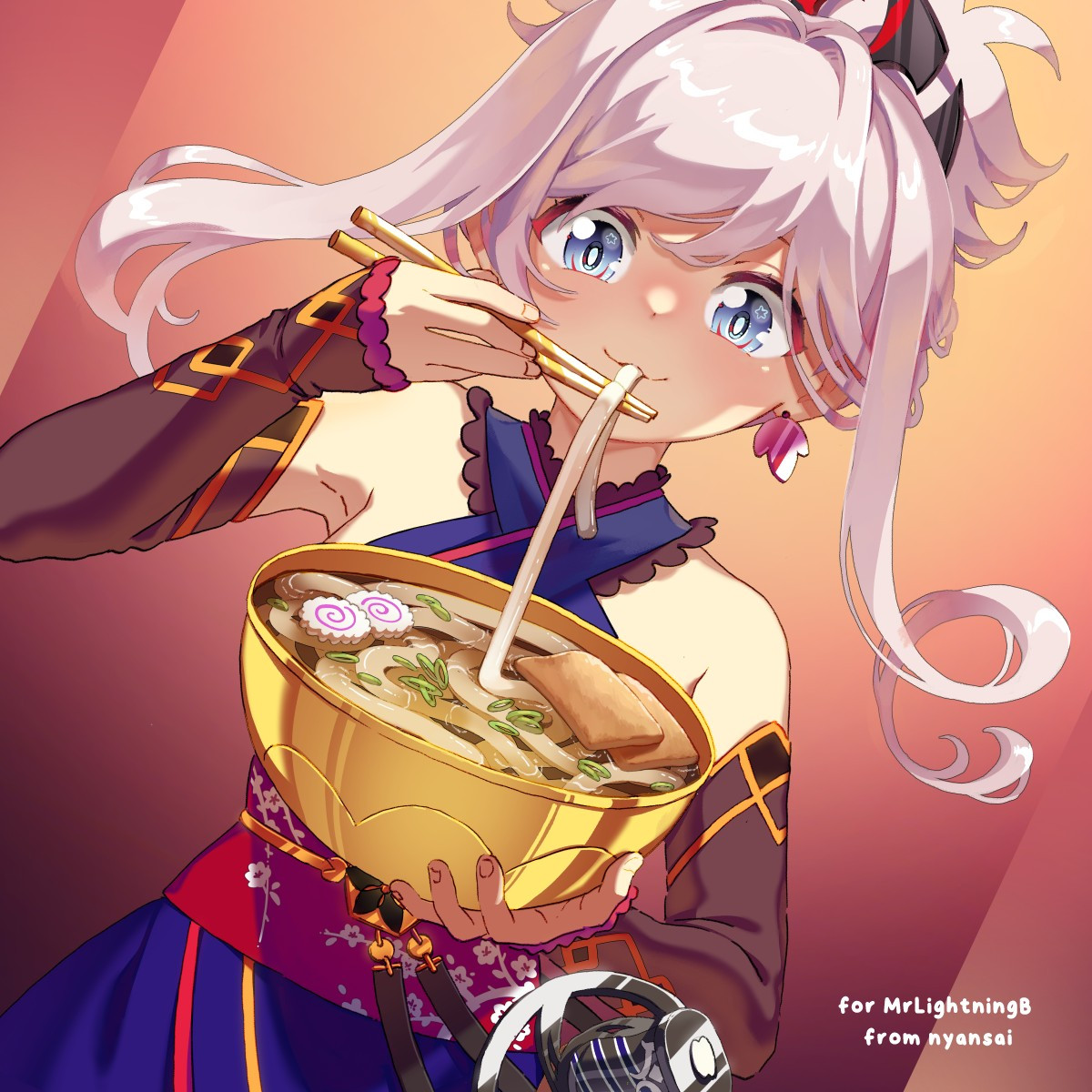 Requesting Hagoromo Gitsune with a smug look posing like this (https://files.catbox.moe/2h27cj.jpg), wrapped up in a blanket on a couch drinking from a mug, or lazily laying on a couch. Anything else is fine, too.
