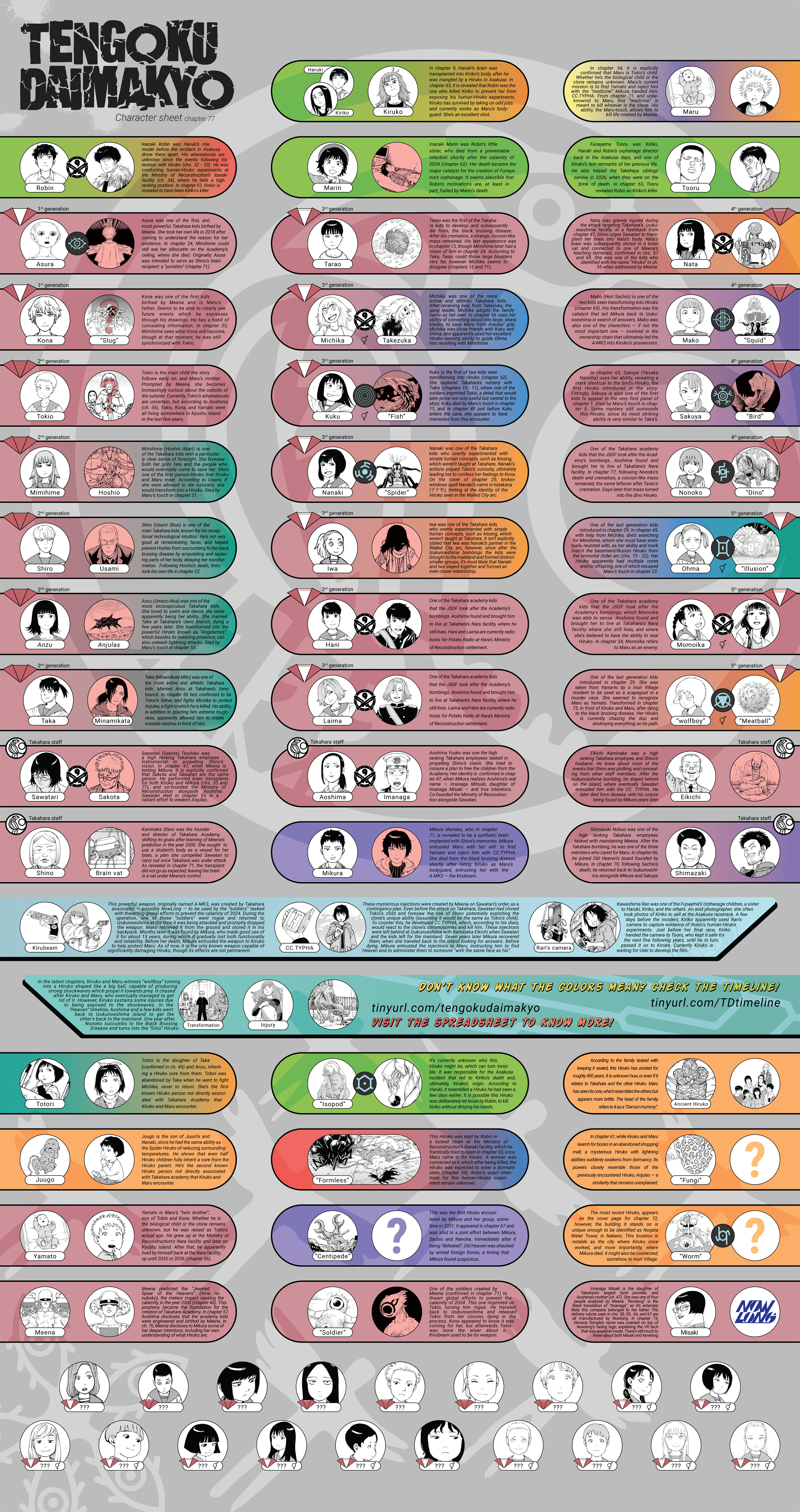 >>283994218>>283994197You're doing such a good job with these infographs anon. I'm really impressed!Are there any official timeline-resources? Like the chapter timeline for soremachi. Would be cool to know what Ishiguro thinks of your visualization