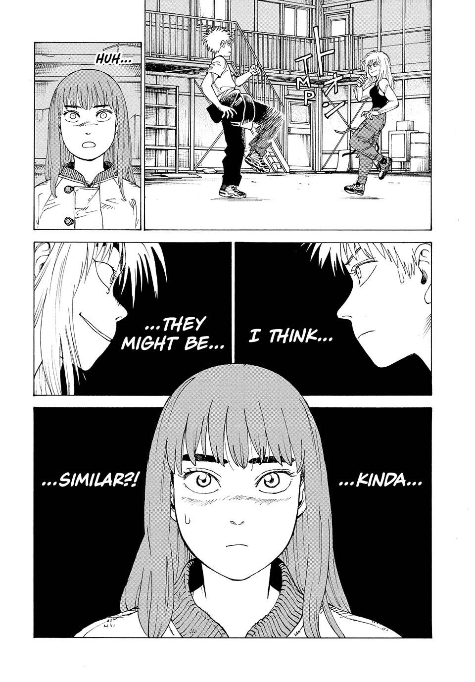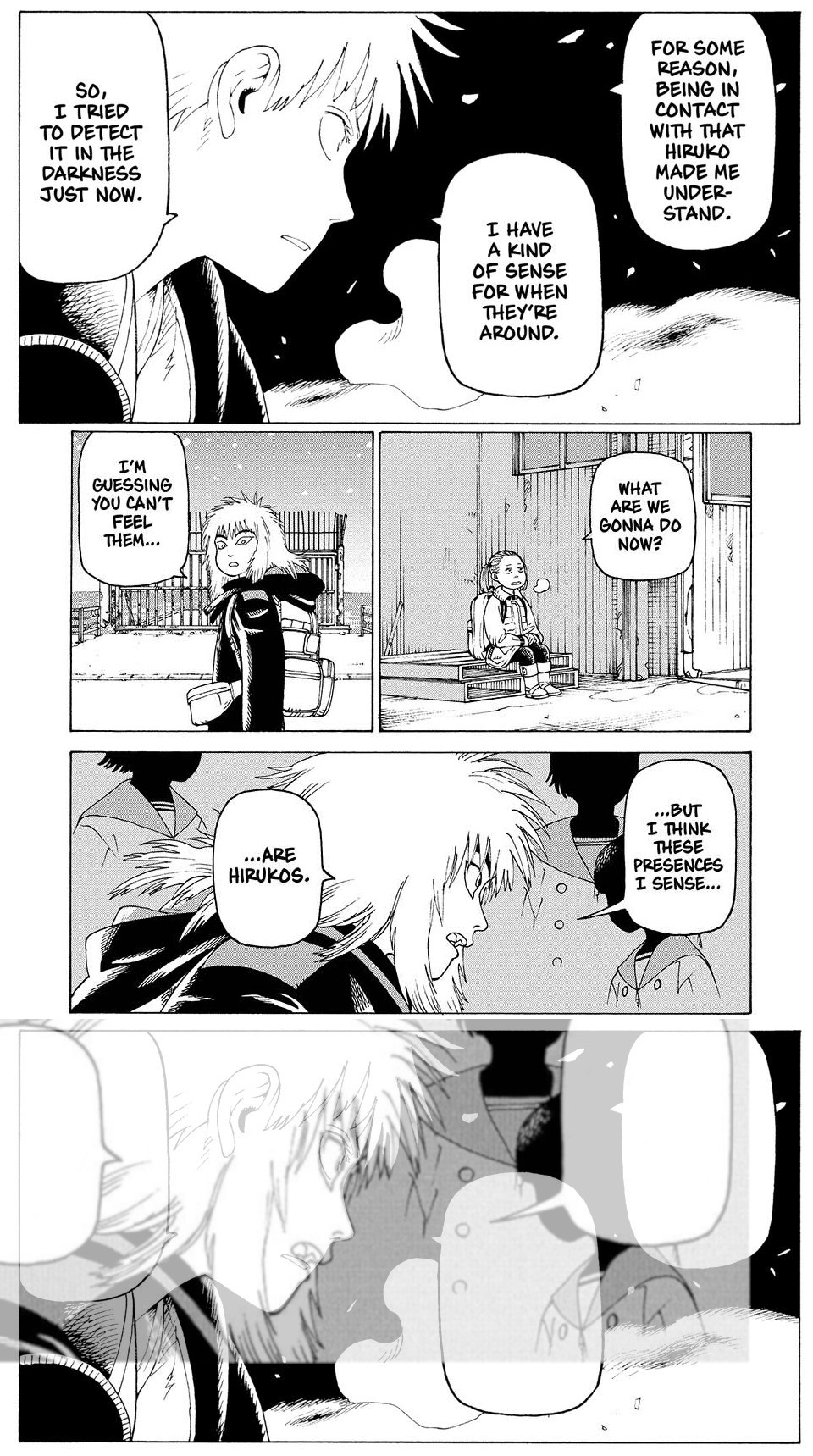 >>284035557>not using gendered pronounsall the kids are called name-kun, regardless of sex. but I guess that's how far Japanese can go in that regard.>Going back and retroactively giving all the kids they/them pronouns from even the first chapter feels like overkill, though.I meant not even using "them". The only allowed pronouns for the kids to use would be I or You.>>284028167>A recent famous example is ThistleThat happened with Tokio, but that was by design anyways. But that mistake has been kept in some translations...>>284031518>>284031556I was actually thinking of ways Maru could manage not to fucking die next chapter, and having him tapping into some ability like that seemed reasonable.Michika obviously has some kinship with Maru because of the way the kids were created. She's probably his biological aunt if you really think about it. Or uncle, whatever. auntcle.Anyways, I can see a way Maru could have been spliced with Michika, but it would require Maru to be the clone. And it hinges on other schizo theories of mine.Meena analyzed Tokio's baby to known his power right? She knew it could end life created by it. Then Sawatari told it to clone the baby. Well, why would Meena want 2 people able to end her own creations roaming around? This is my one of my schizo theories - Maru and Yamato aren't true clones. So what Meena decides to do, is to splice some DNA from the most Hiruko-tuned kid the school had, Michika.Remember when Kona was standing by Tokio? Pic related. Is he using some sort of power similar to the Maru-touch? Humm... what could it be? Could a combination of that type of power with Michika's Hiru-sense end up creating the Maru-touch? Who knows!