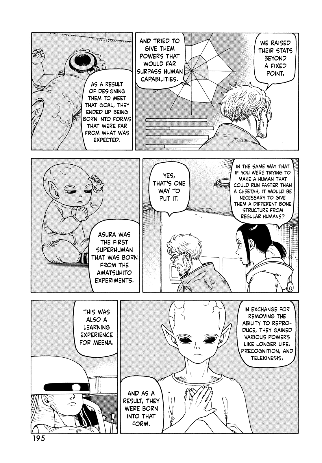 >>283993627>"These children were created for the purpose of building a utopia, but they still have a right to live free and equal lives.">"You're absolutely right. You know, in some ways you've changed, Sawatari-sensei." >"I've been thinking about it since then... but, Nonoko...">"No, Tarao too... they're probably both still alive.">"Huh?">"We assume that that mass came out of a dead body,">"But isn't that just based on our preconceptions as a human?" >"I did what gra -... the Director told me to do,">"And I made Asura and the Warriors, superhumans that looked like aliens.">"But that's not because we designed them to look that way...">>283993657>"We raised their stats beyond a fixed point,">"And tried to give them powers that would far surpass human capabilities.">"As a result of designing them to meet that goal, they ended up being born into forms that were far from what was expected.">"In the same way that if you were trying to make a human that could run faster than a cheetah, it would be necessary to give them a different bone structure from regular humans?">"Yes, that's one way to put it.">"Asura was the first superhuman that was born from the Amatsuhito experiments.">"In exchange for removing the ability to reproduce, they gained various powers like longer life, precognition, and telekinesis,">"And as a result, they were born into that form." >"This was also a learning experience for Meena."