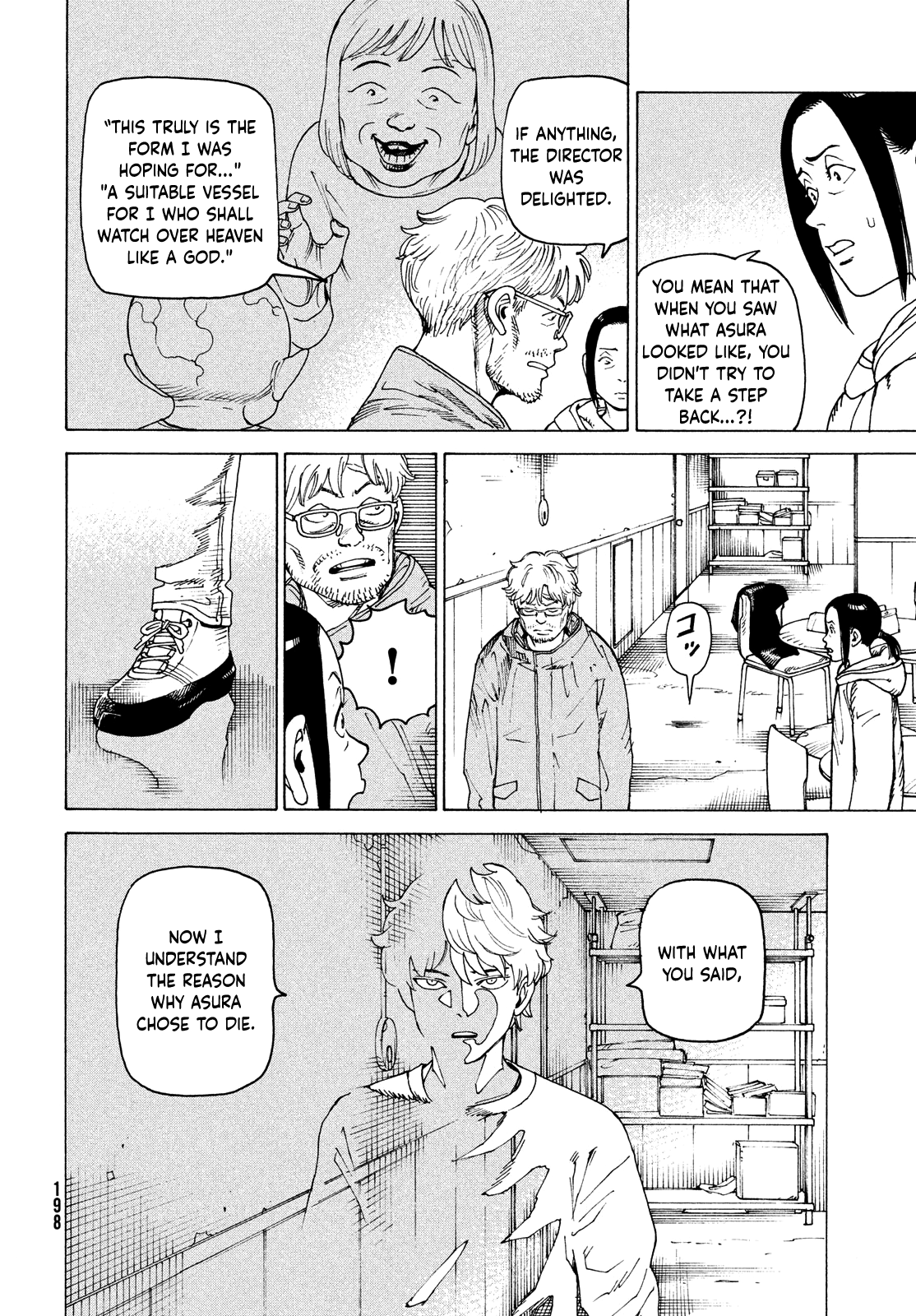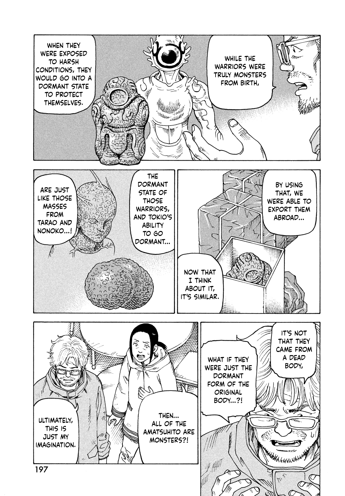 >>283993693>"As a result, with the second one... from Kona's generation onward, we tried to make it so that their appearance as a human would stay intact." >"But, we were already..." >"The act itself of a human designing another human was probably already a step too far.">"We didn't give birth to superhumans or a new species of human,">"What we probably gave birth to was monsters...">"Their human shape is just temporary,">"And once they're ready, they break out into a disease that makes black marks appear, remove their human shell,">"And the monster awakens." >>283993726>"While the Warriors were truly monsters from birth,">"When they were exposed to harsh conditions, they would go into a dormant state to protect themselves.">"By using that, we were able to export them abroad...">"Now that I think about it, it's similar.">"The dormant state of those Warriors, and Tokio's ability to go dormant...">"Are just like those masses from Tarao and Nonoko...!">"It's not that they came from a dead body,">"What if they were just the dormant form of the original body...?!">"Then... all of the Amatsuhito are monsters?!">"Ultimately, this is just my imagination." >>283993758>"You mean that when you saw what Asura looked like, you didn't try to take a step back...?!">"If anything, the Director was delighted.">""This truly is the form I was hoping for...">""A suitable vessel for I who shall watch over Heaven like a God."">"With what you said,">"Now I understand the reason why Asura chose to die."