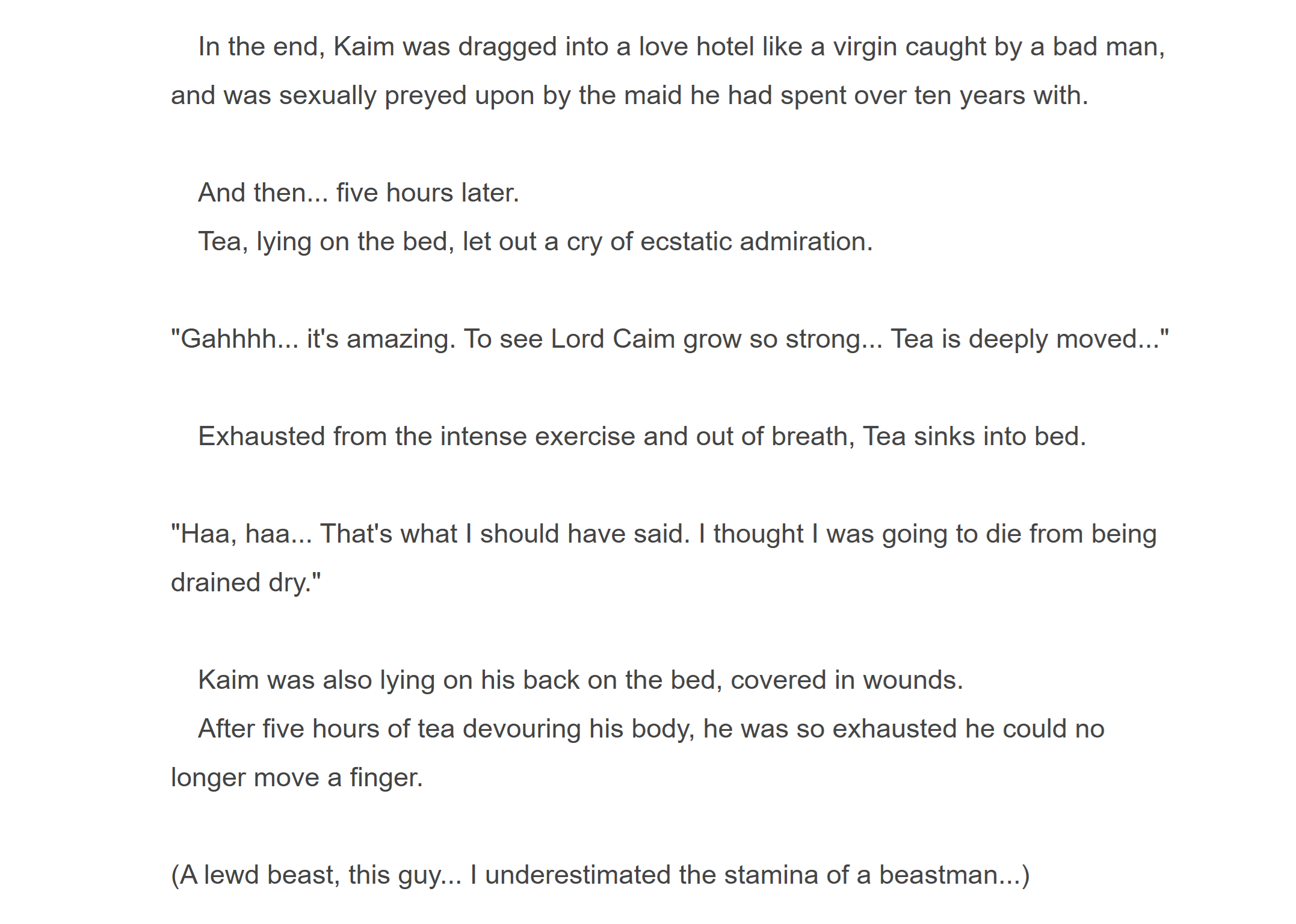 WN writers just don't really land the appeal of revenge stories because they just write long humiliation rituals where the MC always had the upper hand and they're not bringing down a truly despicable antagonist from their pedestal. By the time the choleric villains finally die they just didn't have anything left to lose, so there's very little actual satisfaction to be had at that point. It would be more exciting to see the main character turn the tables and outplay them when they're at their highest. And I'm not even asking for some Montecristo template story where the MC realizes revenge bad and he should've just fucked the teenage slave girl from the start.