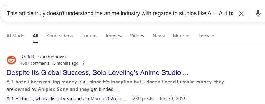>>284096347This article truly doesn't understand the anime industry with regards to studios like A-1. A-1 hasn't been making money from since it's inception but it doesn't need to make money, they are owned by Aniplex Sony and they get funded regardless of making money because even if the BD's don't sell Sony and Aniplex, their parent company, makes major profit on merchandising and if it's one of their own IP's licensing and collaborations.Same reason why Sunrise hasn't been making money despite making Gundam, they are owned by Bandai and don't need to make money at all, they just need to make anime for Bandai to profit off of.
