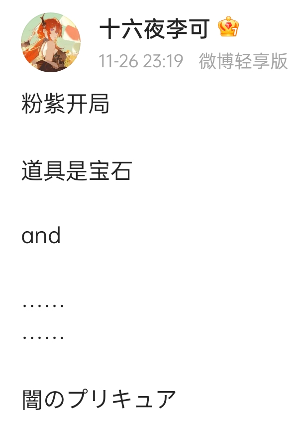 >>284078913Leak from china, found this while browsing one of baidu account who usually posted some toku stuffs>Pink and Purple start>Gimmick props are gemsAnd>PreCure of Darkness