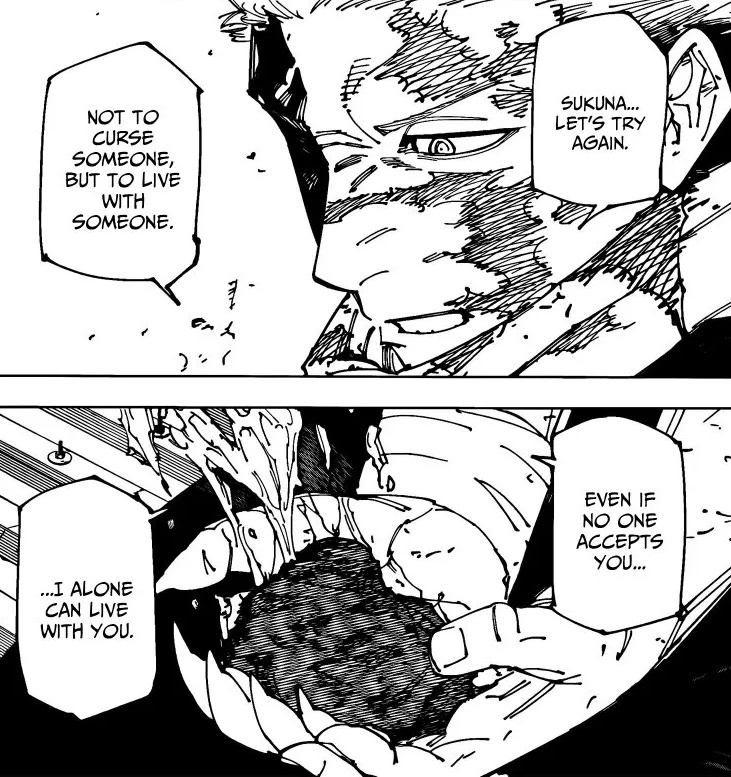 Very cool chapter, Gege is so good at building hype. >Nobara says she says Yuji occasionally, which reminds her of how old she has gotten but can tell from just his face, that Yuji somehow blames himself. My goat is depressed :(>JJK council seem to think that having Yuka accept the duel will draw out Yuji. I am guessing they plan to publicize and broadcast the match through the Mei Mei and Hakari gambling/dueling laws.Also guessing that Megumi might not be dead and he will relay the news as a plea to Yuji. Yuka is technically his cousin(twice removed?).