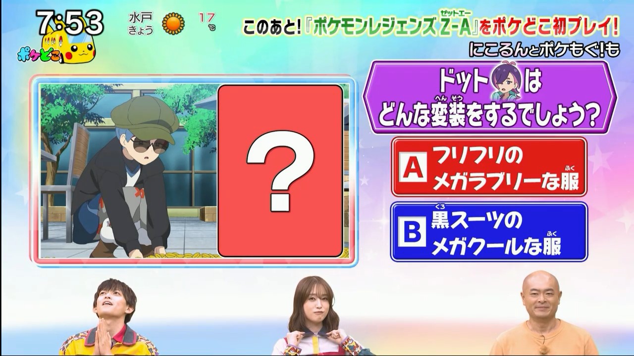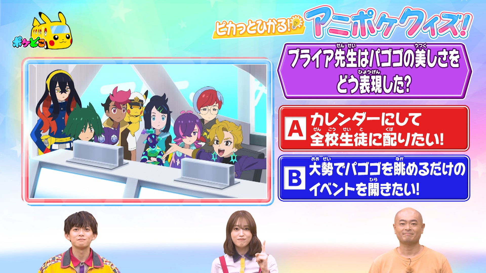 https://x.com/anipoke_PR/status/1993877457343283328>The "Pika tto Hikaru Pokémon Anime Quiz" presented by Pokédoko:>Here is this week's question. Check tomorrow's episode of the Pokémon anime for the answer, okay?>Q: How does Briar-sensei describe how beautiful she thinks Pagogo is?>A: So beautiful she wants to feature it on a calendar and give a copy to every student at the whole school>B: So beautiful she wants to hold an event entirely about letting huge crowds look at Pagogo