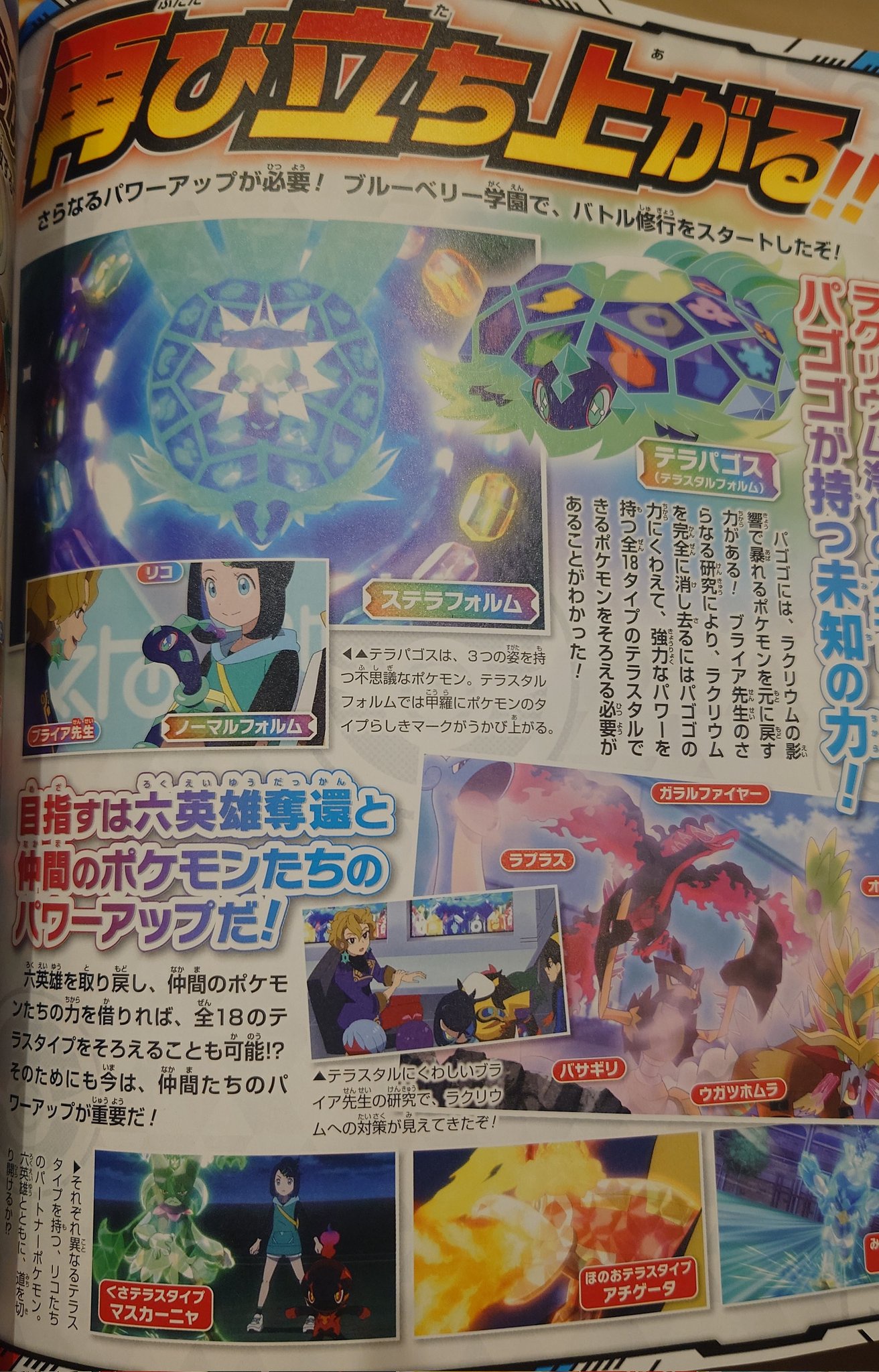 >RISING AGAIN!!>Further powerups are required! Battle training at Blueberry Academy has started!!>PAGOGO'S UNKNOWN POWERS THAT CAN PURIFY THE RAKULIUM AND RESCUE THE SIX HEROES!>Pagogo has the power to turn Pokémon that have been driven berserk by Rakulium back to normal! Briar-sensei's research has made it clear that what's needed to completely eradicate the Rakulium is Pagogo's powers as well as a lineup of powerful Pokémon capable of Terastallizing into all 18 types!>*Terapagos is a mysterious Pokémon with 3 different forms. When it's in its Terastal Forme, marks resembling the different Pokémon types emerge on the shell.>THE CURRENT GOAL IS TO RECAPTURE THE SIX HEROES AND POWER UP THE POKÉMON ON THE TEAM!>If the group gets the Six Heroes back, they may be able to have all 18 Teras types available if they get help from the Pokémon currently on their team as well?! That's another reason it's now important to power up the Pokémon they have!>*Thanks to Briar-sensei's research, a countermeasure against the Rakulium is starting to become apparent!>*Liko and the others' Partner Pokémon all have different Teras types. Will they be able to pave the way alongside the Six Heroes?!