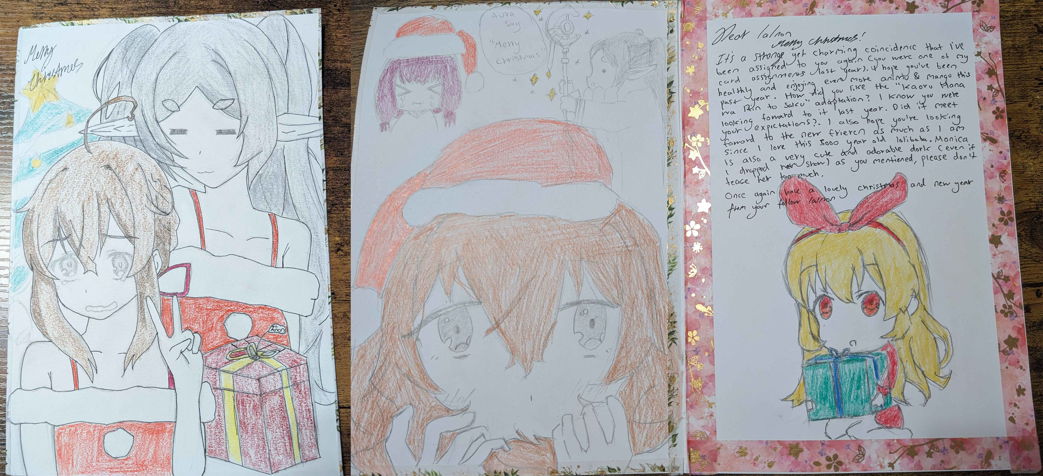 I received my first card this week from GB of UKThank you for the second great card! I was hoping I would get at least one Monica card this year, so I'm glad you chose to draw her. Kaoru Hana's adaptation was super cute, I felt like they did a great job with it.What made you drop Silent Witch? I enjoyed it enough to immediately pick up the light novel, though I haven't really had much time to read lately.Thanks again and I hope you have a great Christmas!