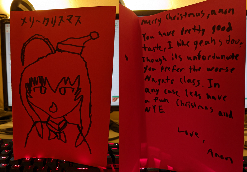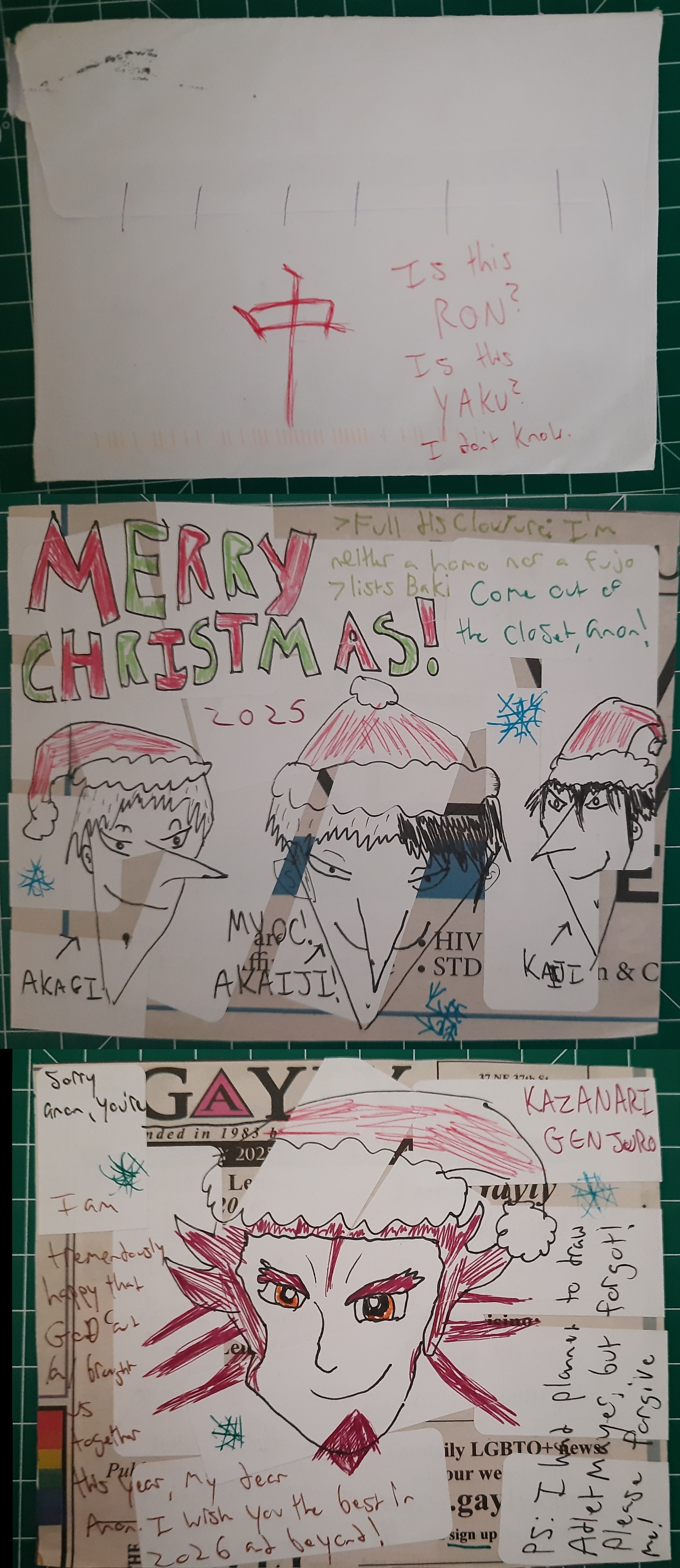 The holiday season has officially started with the first cards coming in. Here's a homocard from FP of OK / USA.I know signing up for a homocard exchange and going "no homo though" is cheeky. But Baki isn't that gay, it's about martial arts and stuff! Okay, it is pretty gay, but it doesn't mean anything!Akaiji is a dream that would've best remained undreamed, he'd be one overpowered motherfucker. And that Genjuro was recognizable enough, so there's that.Well, this was one shitpost of a card, but it did make me laugh. Hope you'll have a merry Christmas and a happy new year, anon.