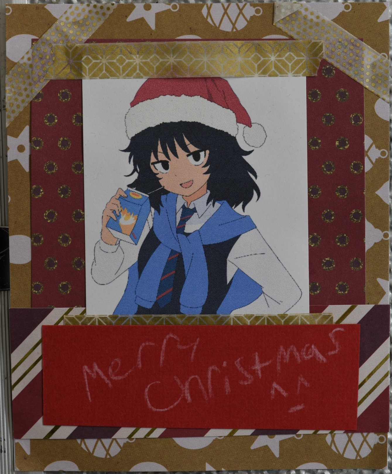 Next up is a card from JM of MD / USA.Thank you for this sweet SamFlam card. The picture doesn't really show it, but I like the 3D effect with the multiple layers here. Maybe I'll do something like that next year instead of what I went with this time.You didn't have to feel obliged to watch through all of SamFlam at my request, but I am glad you did and that you enjoyed it. It's nice knowing even in 2025, people still pick this up from time to time even if they've heard certain things about it. I share your feelings about the last arc. It's really cool what they managed to pull off there, with seemingly nowhere to go. Speculation in the threads were also really fun because parts of it were predicted.Also, nice knowing we have some common favourites and that you're a fellow hag-lover as well. The sleepy Kazuho is really cute, too.Thanks again for the wonderful and have a merry Christmas and a wonderful 2026.