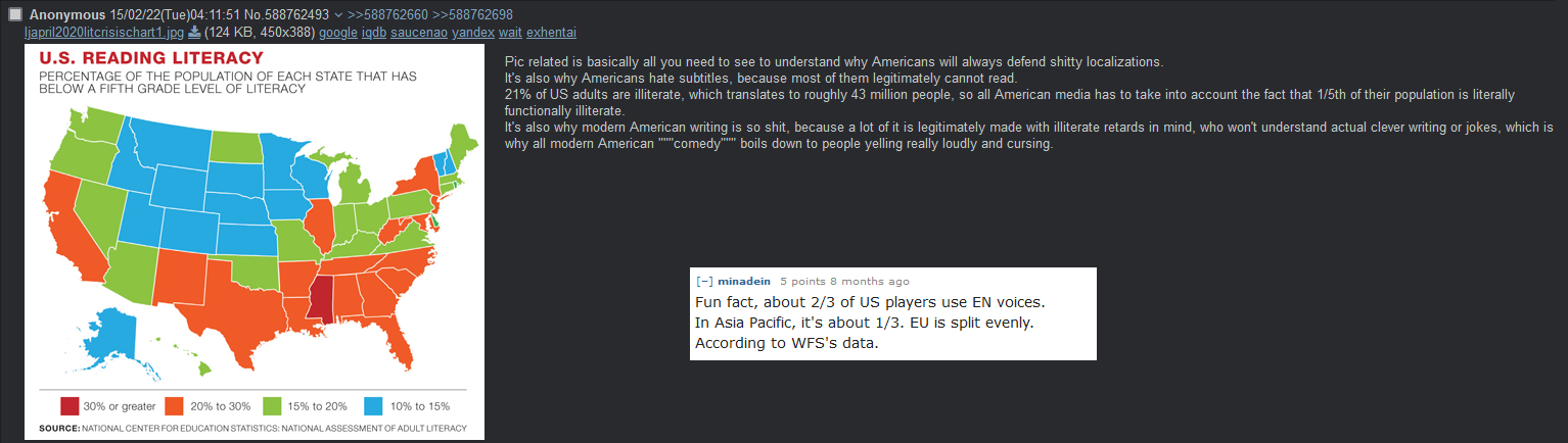 >>284120849You’d be surprised at the amount of Americucks who for some reason can’t stand having to read subtitles when watching anime, so they prefer to watch dubbed with their flat voices.